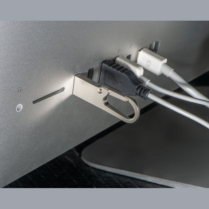 Metal USB stick featuring 8 GB capacity and an integrated snap hook for convenient attachment.