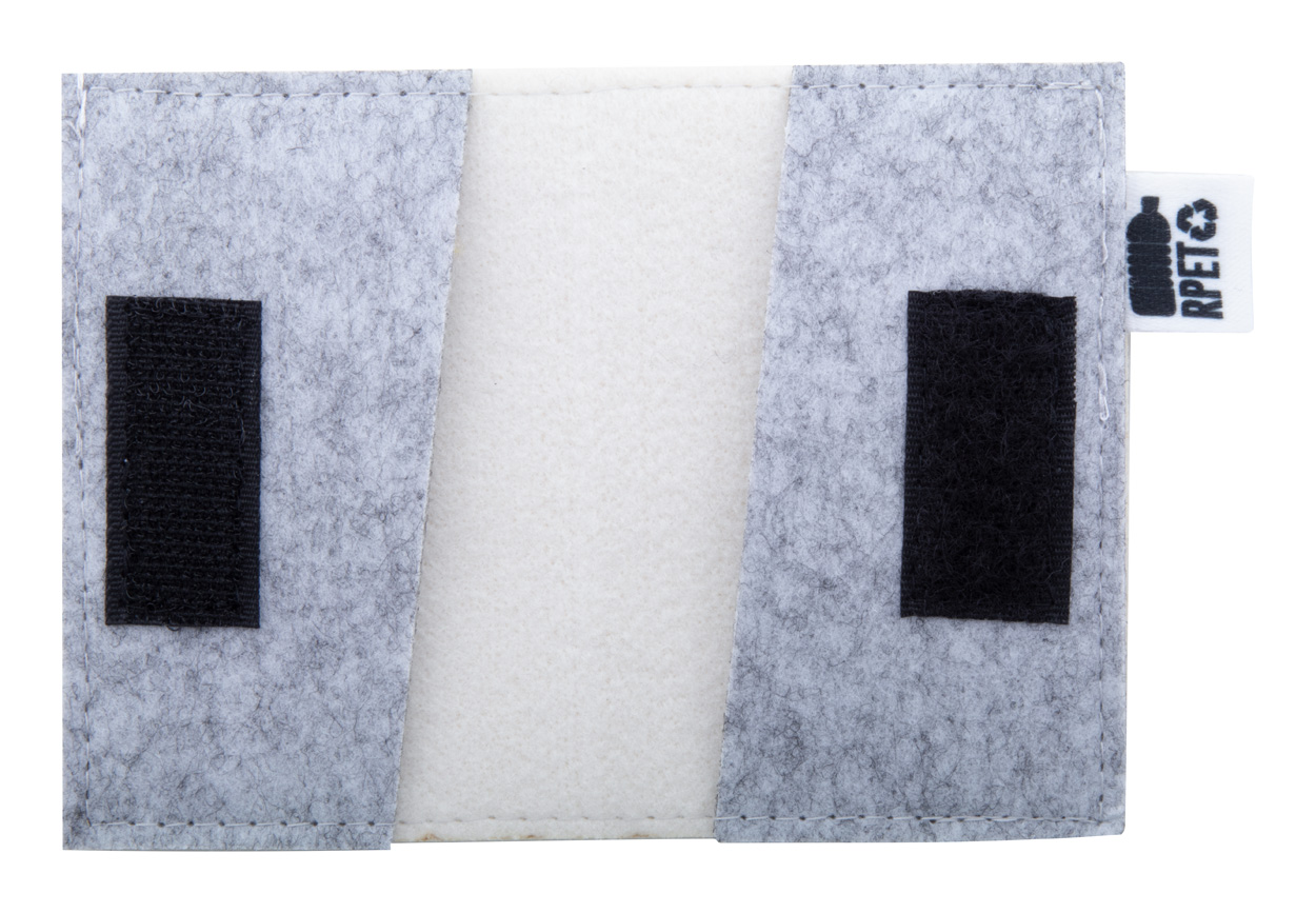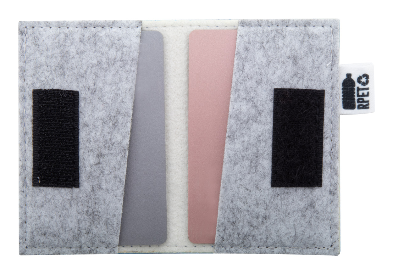 Custom made, RPET felt credit card holder with 2 card slots, velcro closure and full colour printed cover. With distinctive RPET label. Price includes sublimation printing. MOQ: 50 pcs.