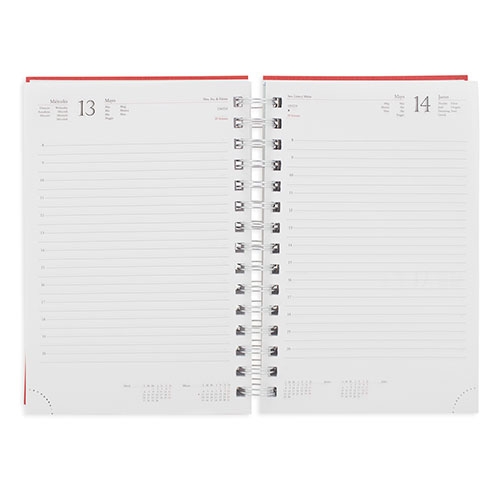 includes 352 microperforated pages, with day/page refill in 5 languages, national and international holidays, triennial calendar, addresses and telephones of interest... and a deployable.