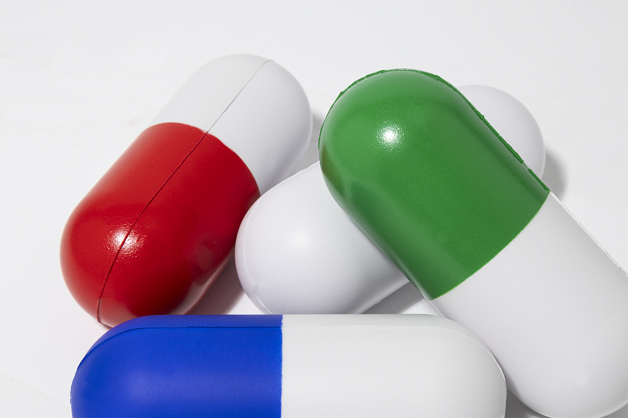 Capsule shaped antistress ball in PU foam.