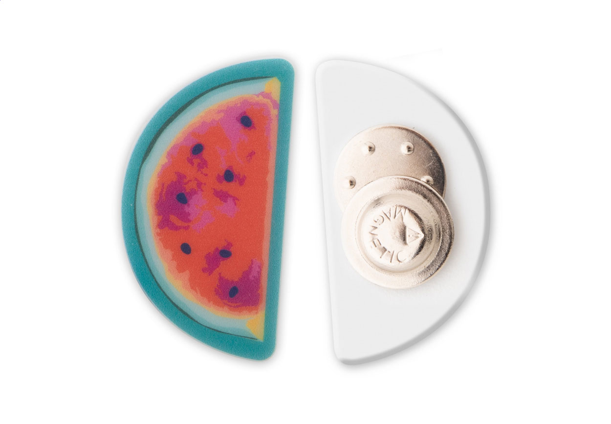 Custom made plastic badge with magnetic pin and full colour printing. Produced in custom shape - maximum size: 50x50 mm. Price includes UV LED printing. MOQ: 100 pcs.