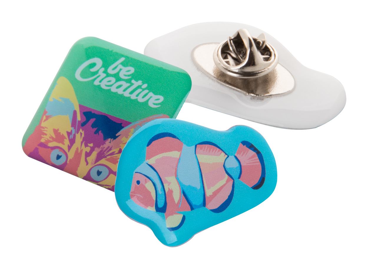 Custom made epoxy domed badge with metal pin. With custom graphics and shape. Maximum size: 9 cm². MOQ: 100 pcs.