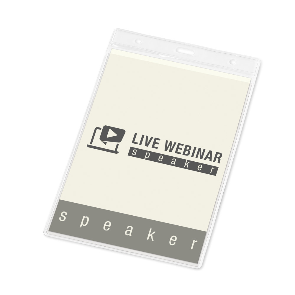 Vertical badge holder in PVC. This badge holder has holes that allow the use of a carabiner. 110 x 170 mm