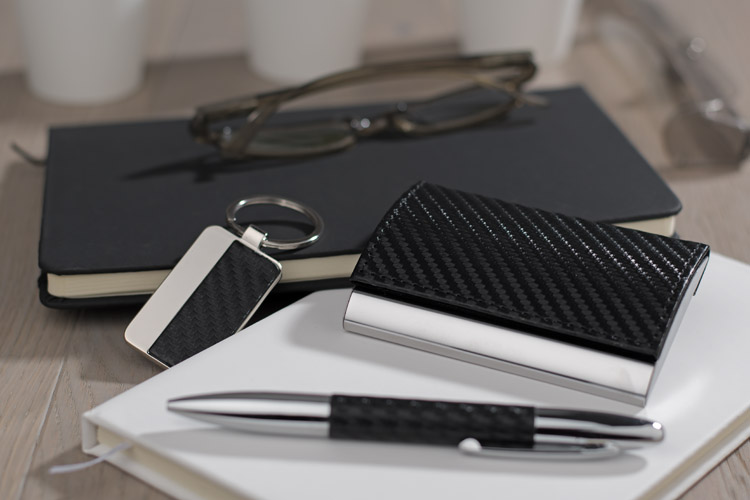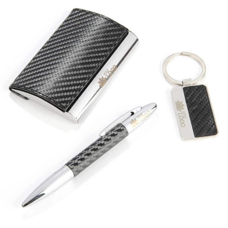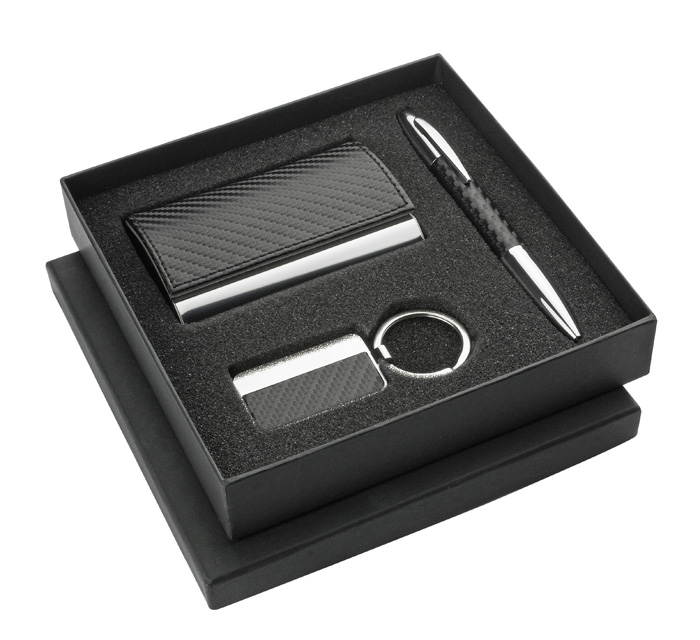 Elegant gift set which includes business card holder, key chain and a ball pen. All packed in a black box. Logo can be engraved on the keychain or business card holder.