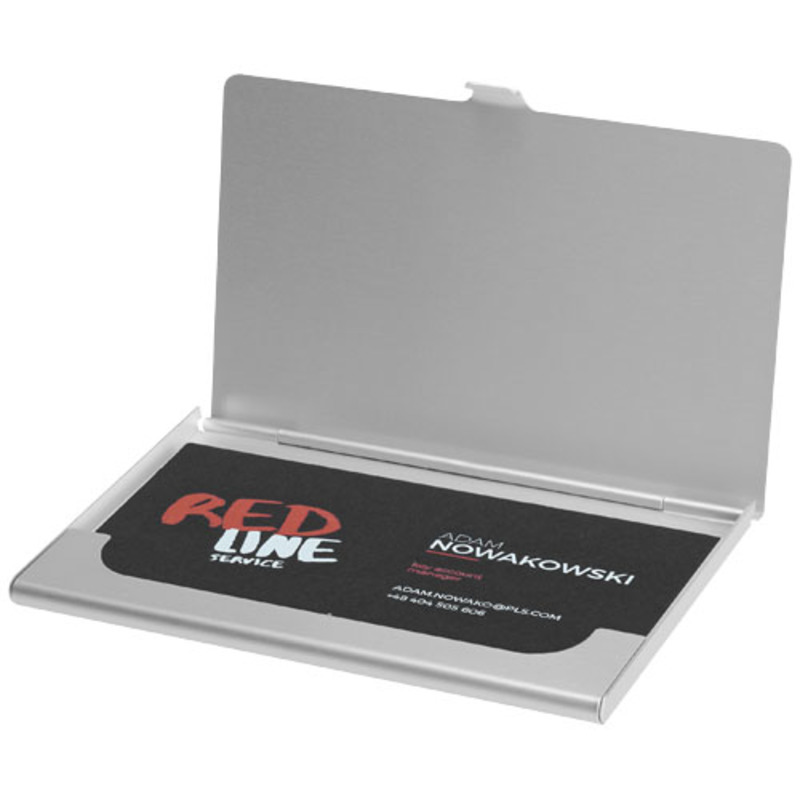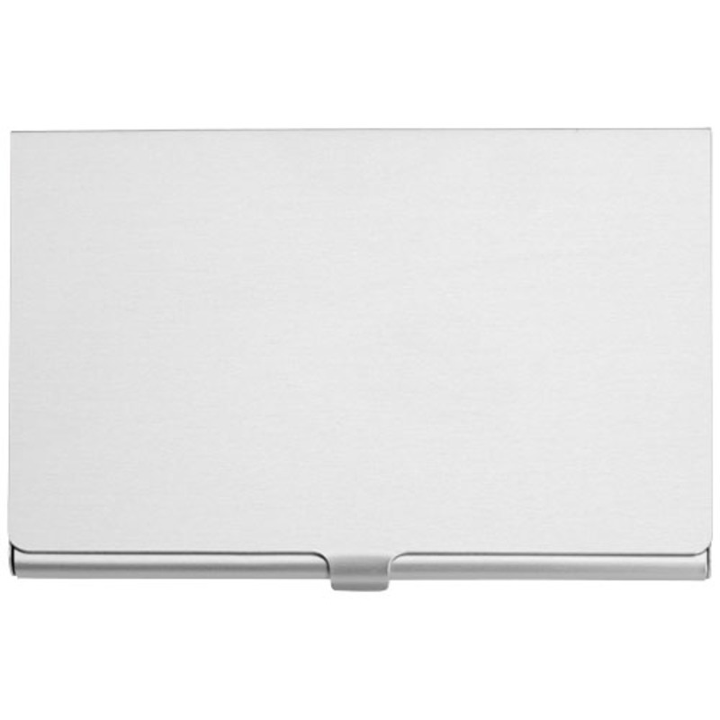 Aluminum business card holder. Holds approximately 10 business cards.