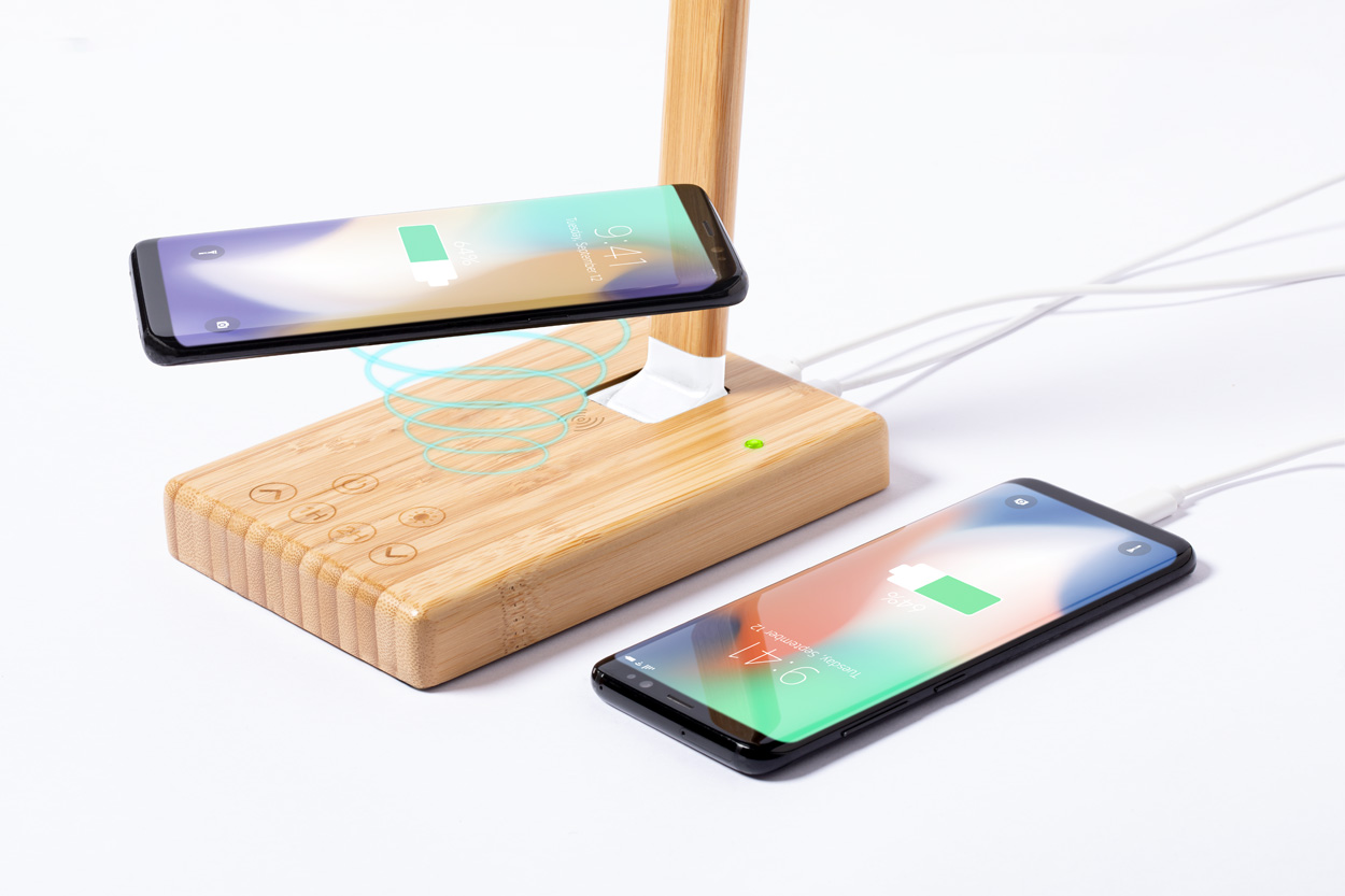 Bamboo multifunctional desk lamp with 25 LEDs, adjustable brightness and 1/2 hours timer. With built-in wireless fast charger (10W) and USB charger port for charging 2 devices simultaneously (1 wirelessly and 1 via cable). Including USB charger cable.