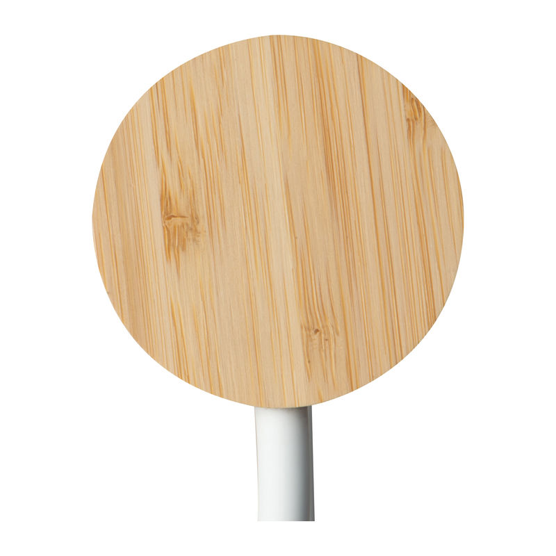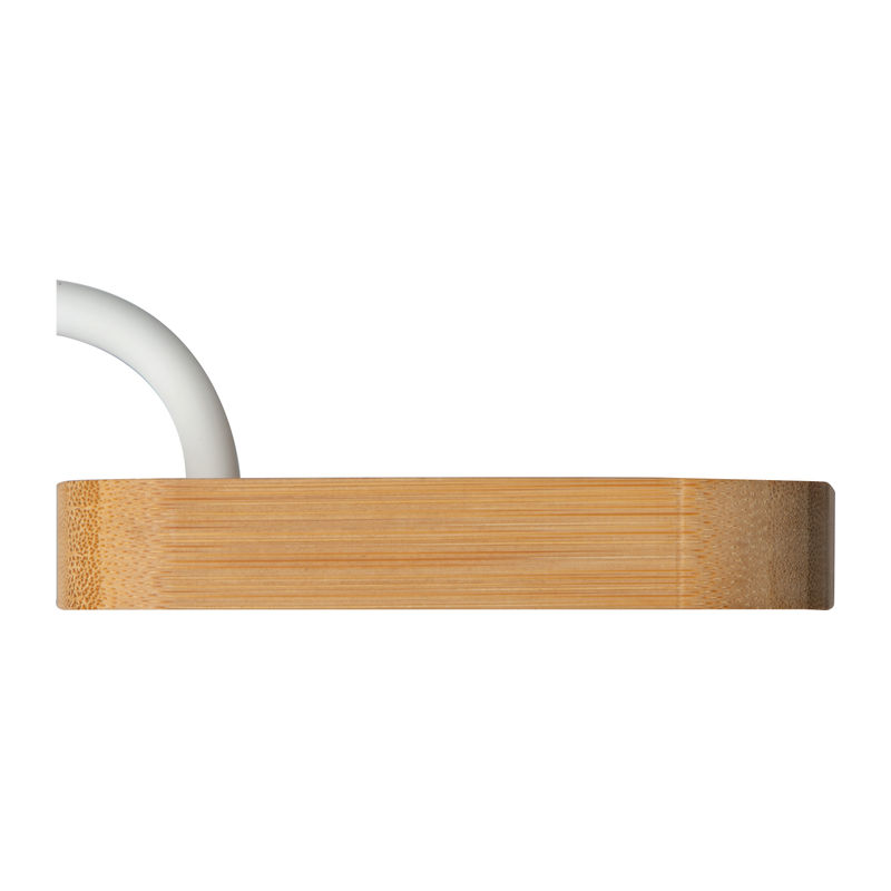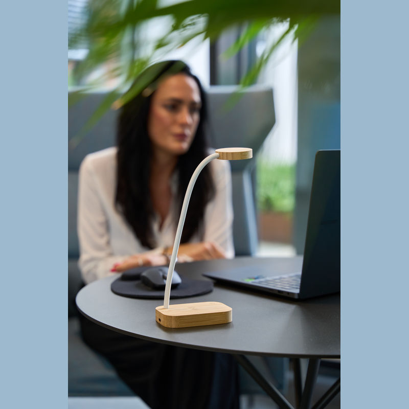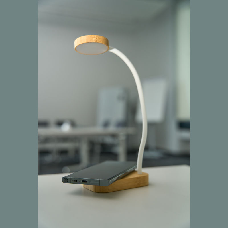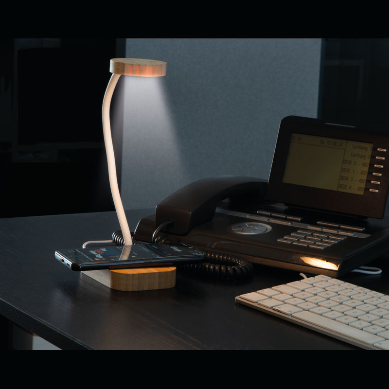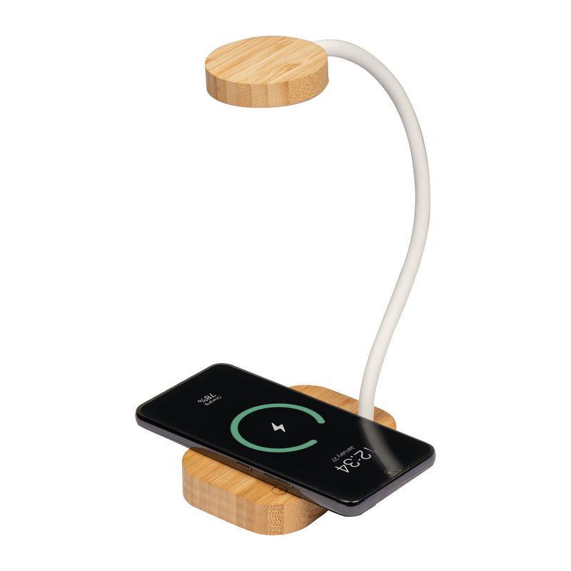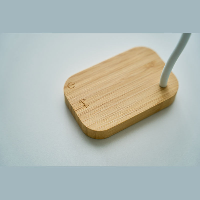Versatile lamp crafted from bamboo, featuring three lighting modes: warm light, cool light, and dimmed warm light. The integrated induction charger (15W) within the bamboo base enables convenient charging of all induction-compatible smartphones. ach unit and engraving is unique due to the natural bamboo material.