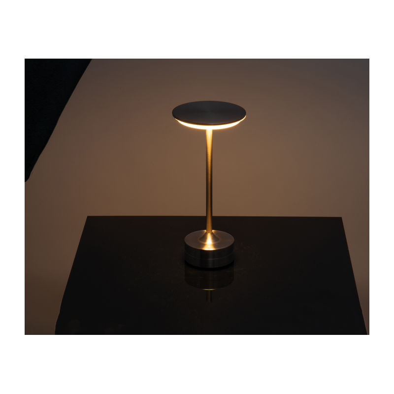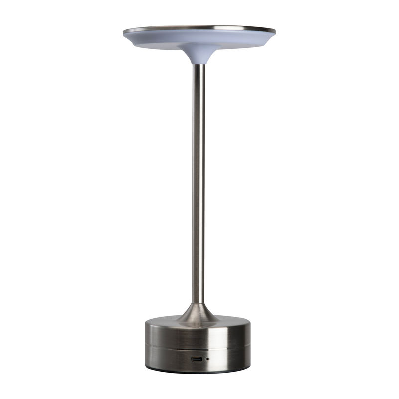 Stainless steel table lamp with rechargeable battery (800 mAh power). The lamp is dimmable and the light colour can be changed between warm and white light. Includes C-type charging cable. We engrave your logo on the base of the lamp.