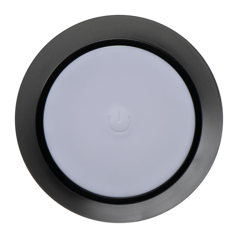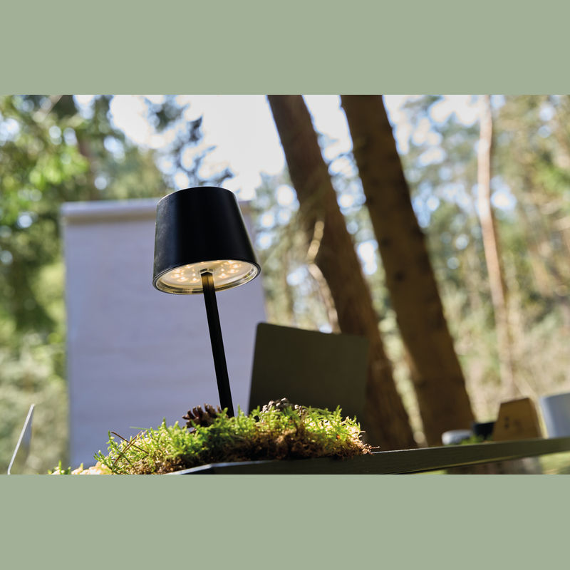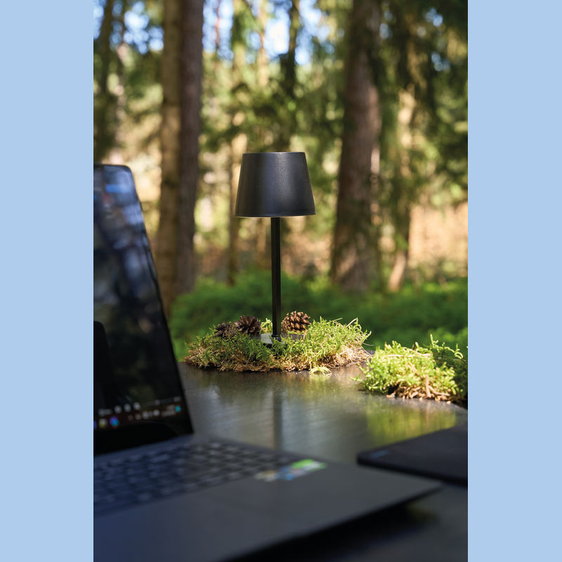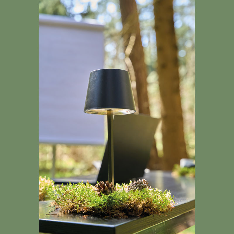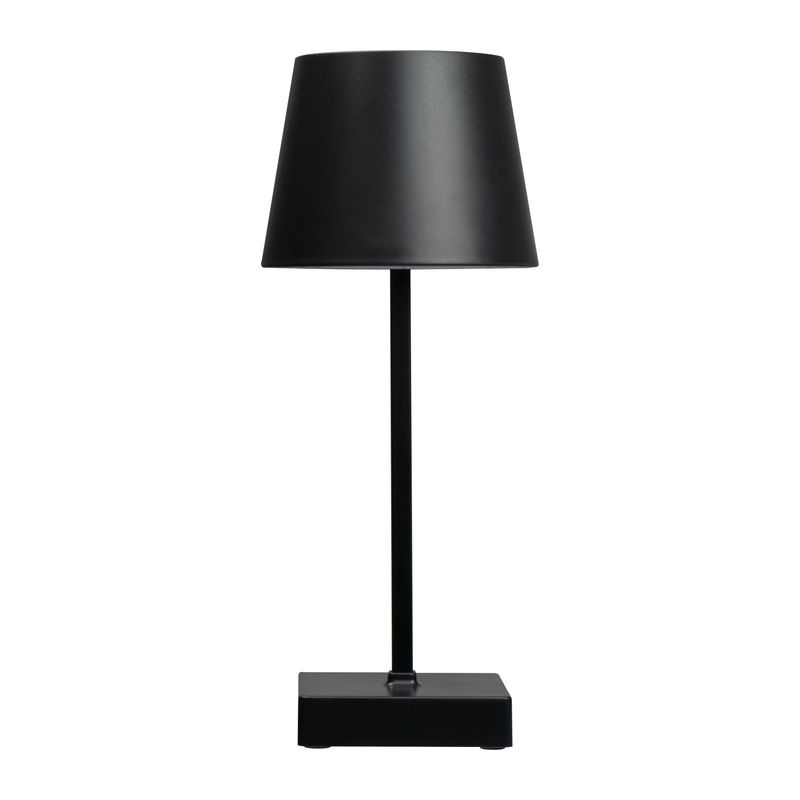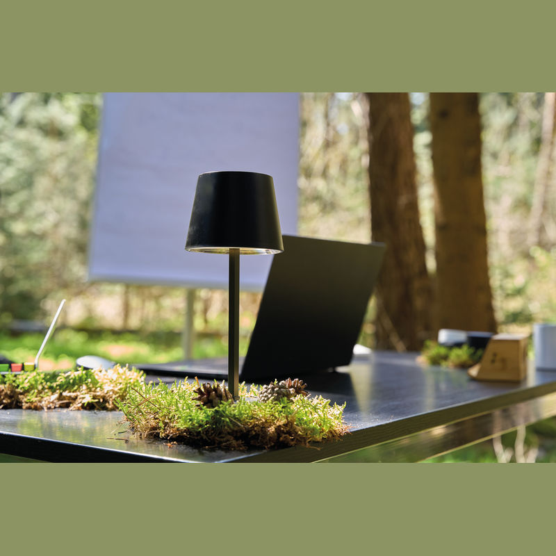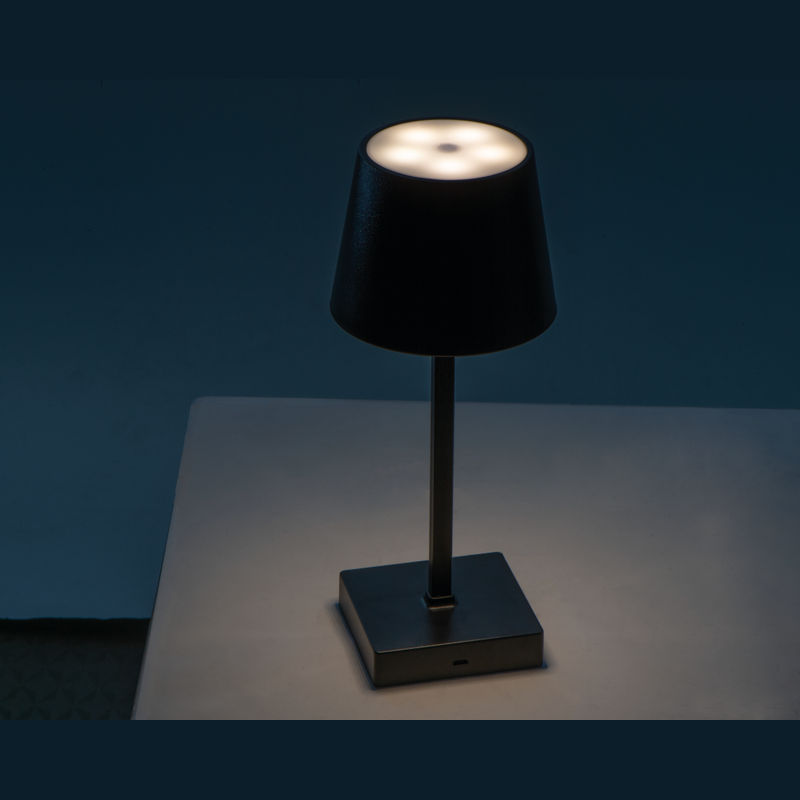 Plastic table lamp featuring a touch-sensitive control, infinitely dimmable settings, and a rechargeable battery.