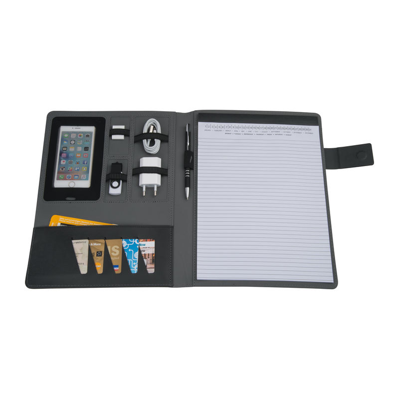 A4 conference folder featuring multiple compartments and loops, a mobile phone pocket, a notepad with 40 lined pages, and a secure magnetic closure.
