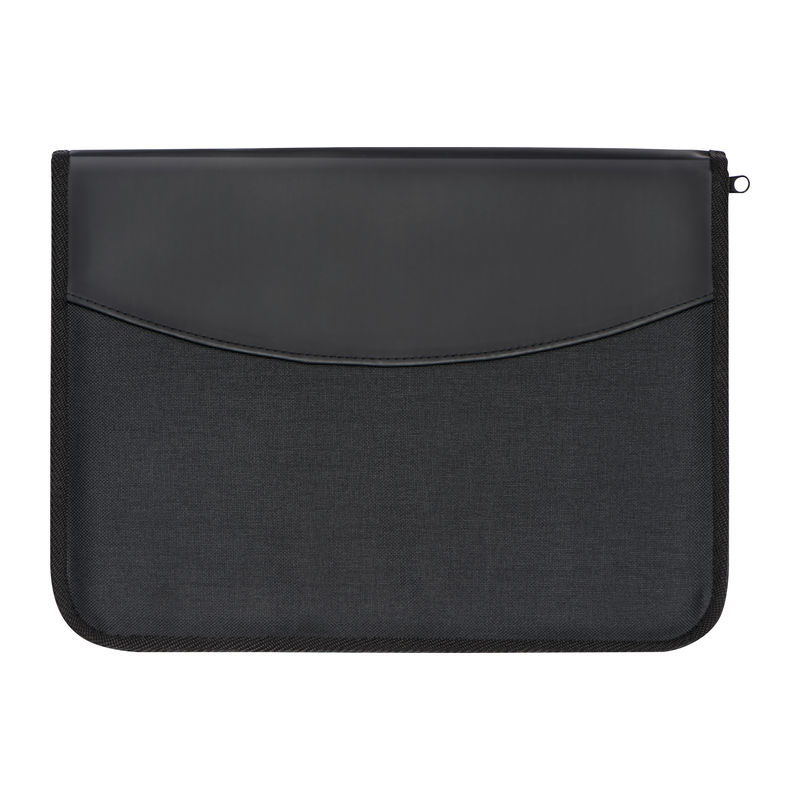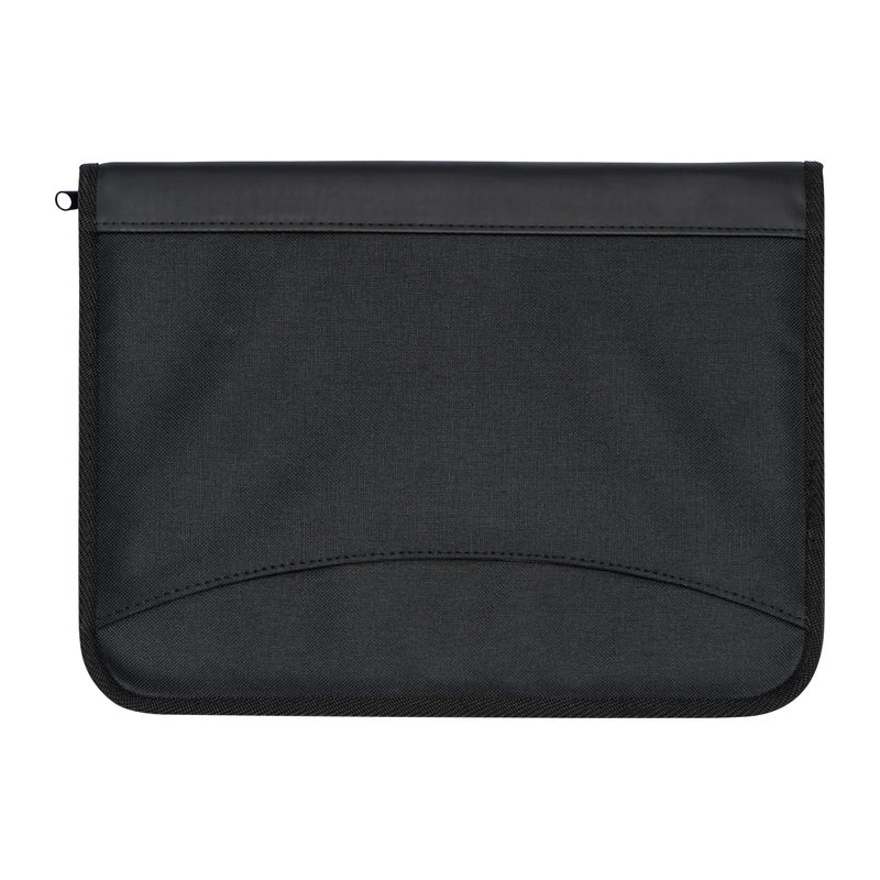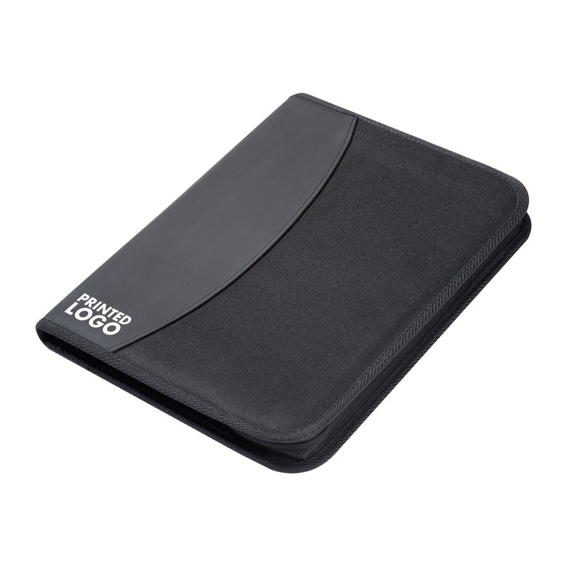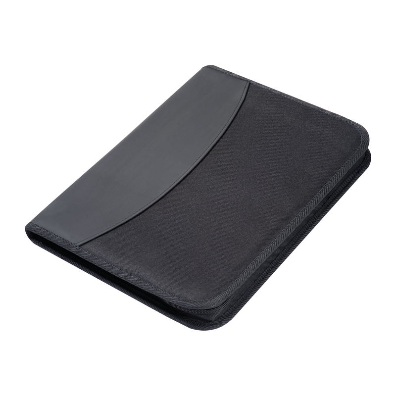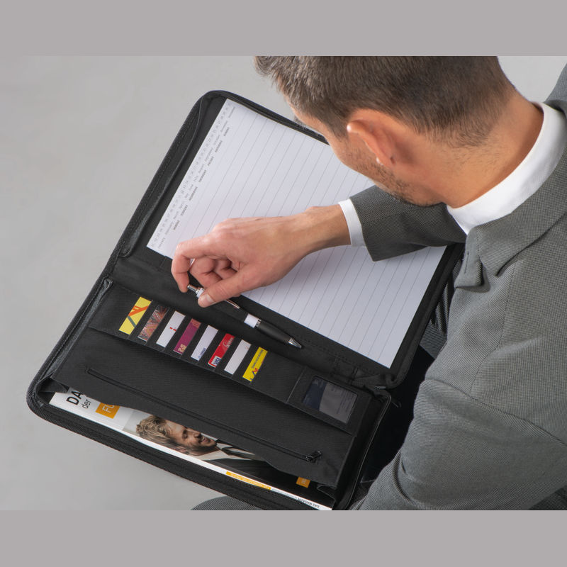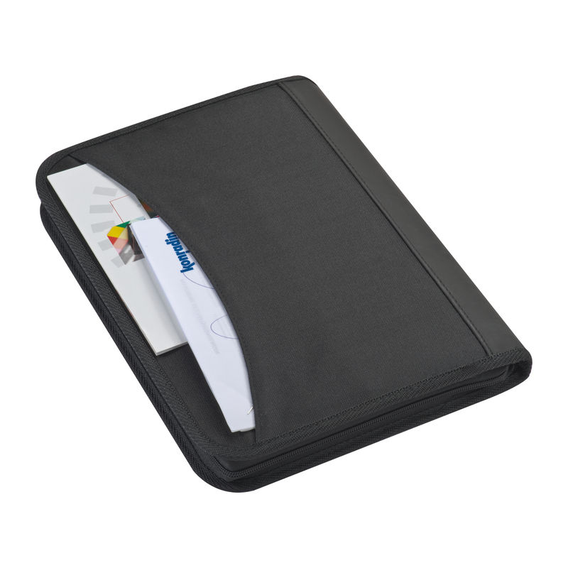 A4 conference folder made of 600D polyester, with note pad, several organizing compartments, and zipper. We will print your logo on the cover.