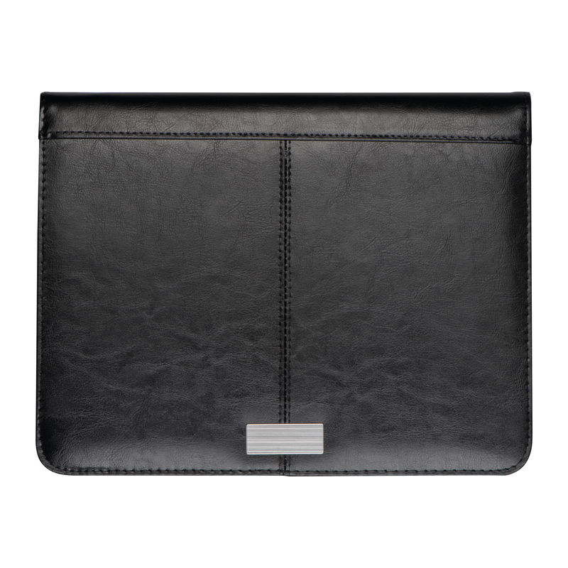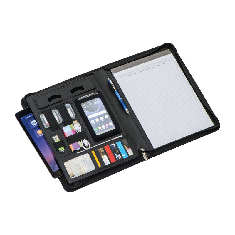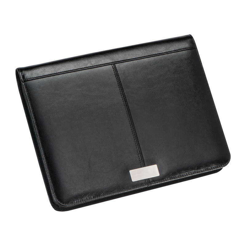 A4 folder made of imitation leather, with zipper, slip pocket, business card slots, pen loop, smartphone holder and stand, compartment for tablet or notebook, and lined block with a small calendar impression. We will engrave your logo on the outer metal plate.