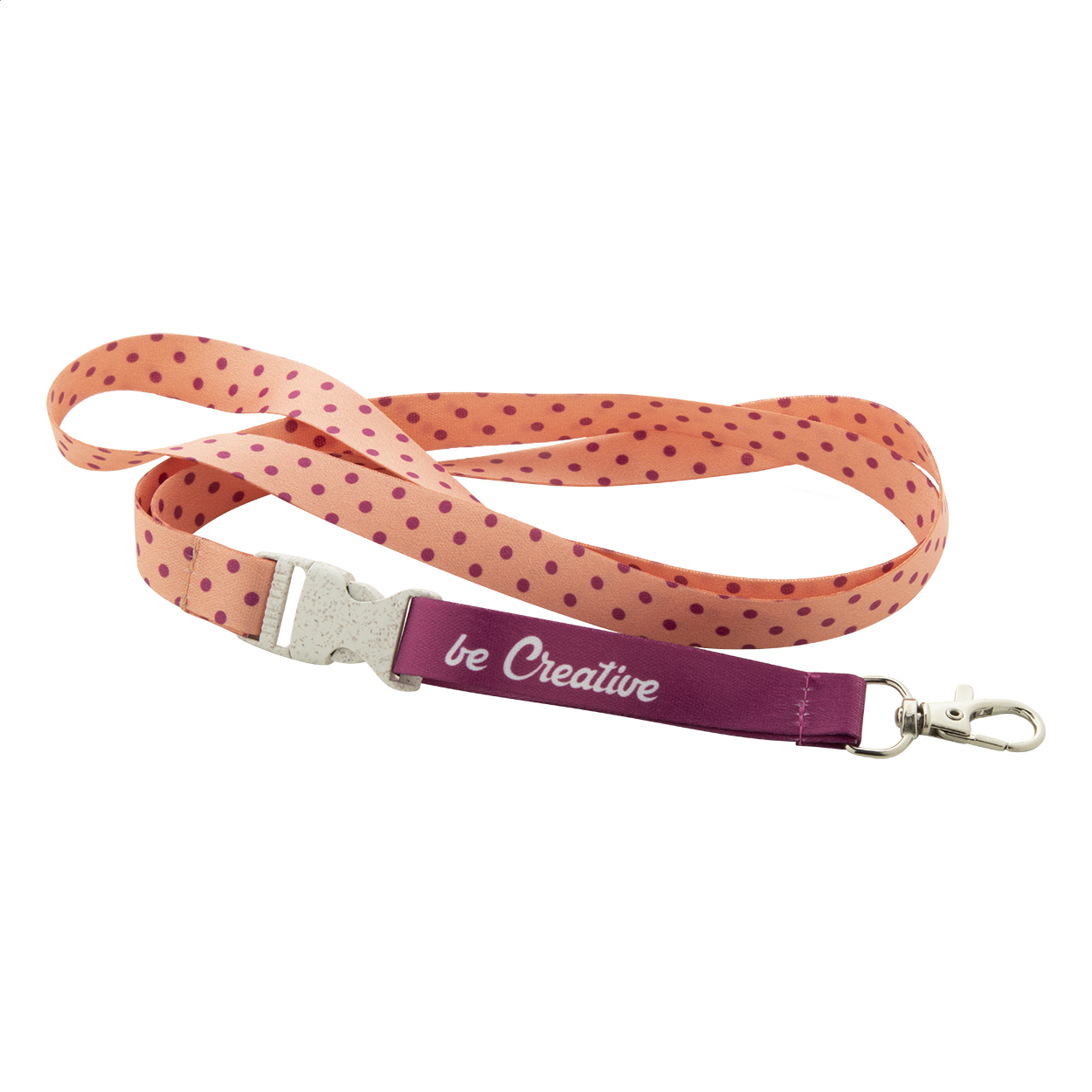 Custom made, 15 mm wide RPET lanyard with detachable metal carabiner and wheat straw plastic buckle. With sublimation printed graphics on both sides. MOQ: 100 pcs.