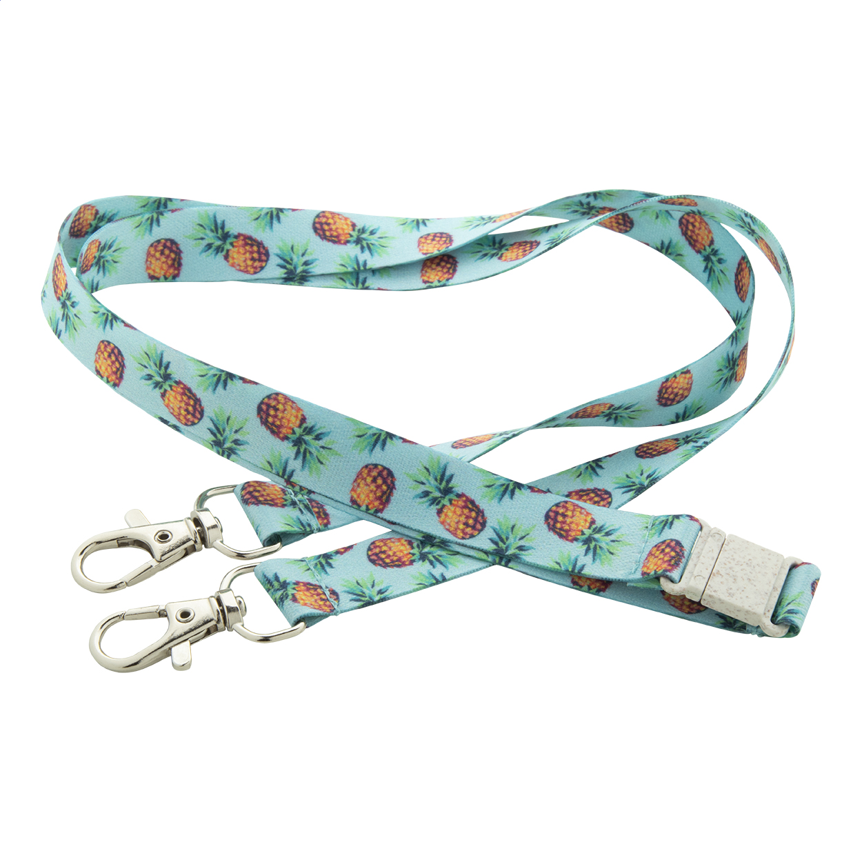 Custom made, 15 mm wide RPET lanyard with 2 metal carabiners and wheat straw plastic safety buckle. With sublimation printed graphics on both sides. MOQ: 100 pcs.
