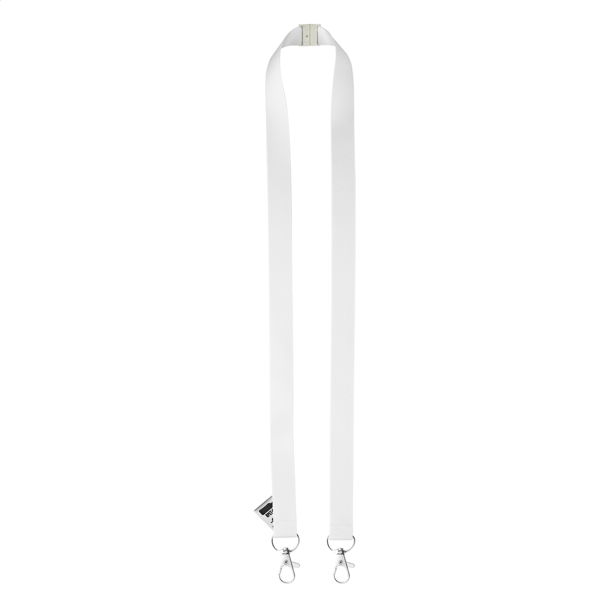 Custom made, RPET lanyard with 2 metal carabiners and wheat straw plastic safety buckle. With sublimation printed graphics on both sides. MOQ: 100 pcs.