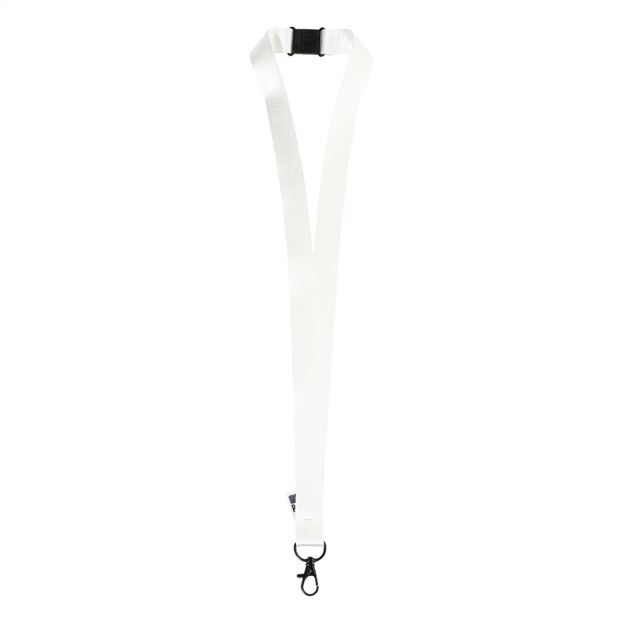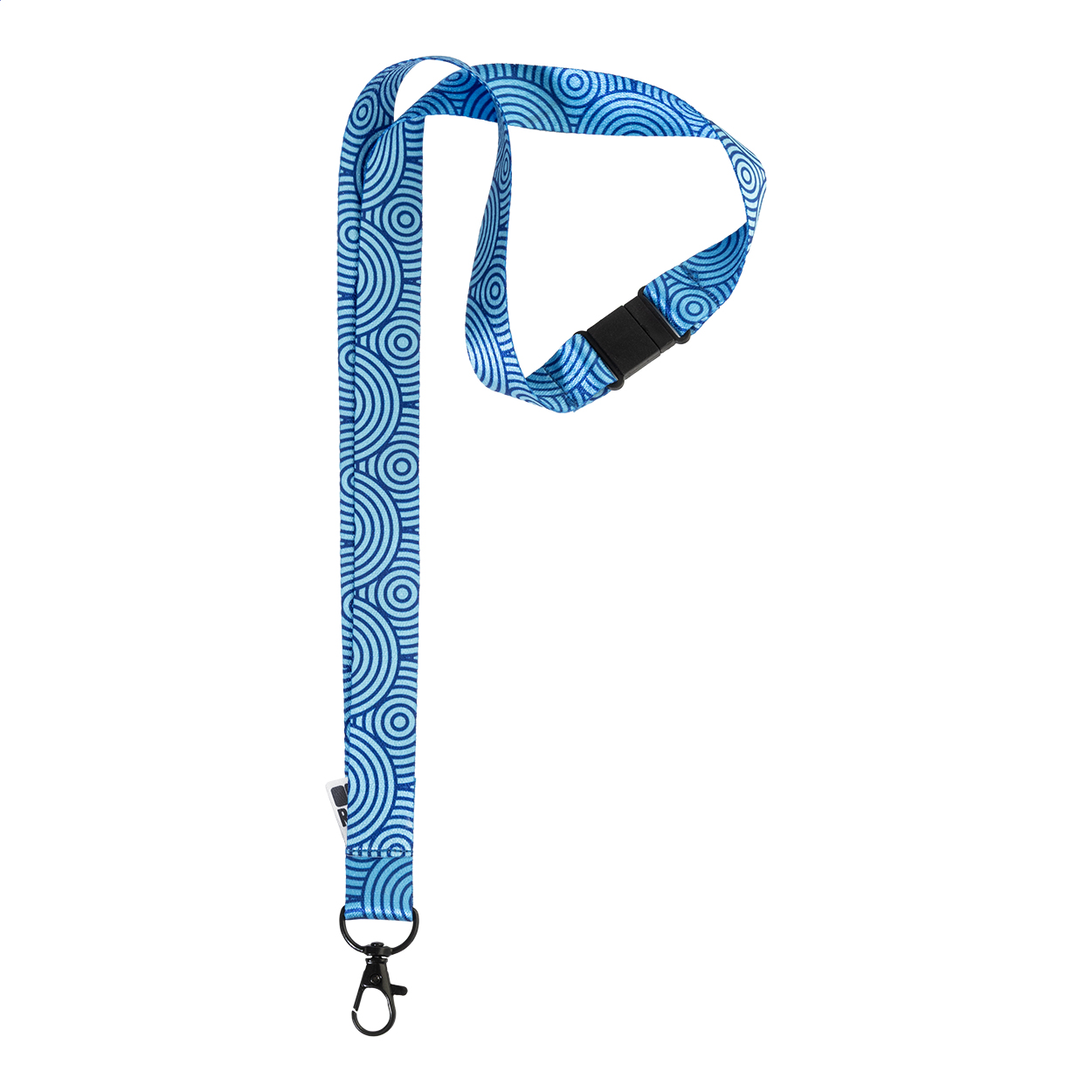 Custom made, RPET lanyard with coloured metal carabiner and safety buckle. With sublimation printed graphics on both sides. MOQ: 100 pcs.