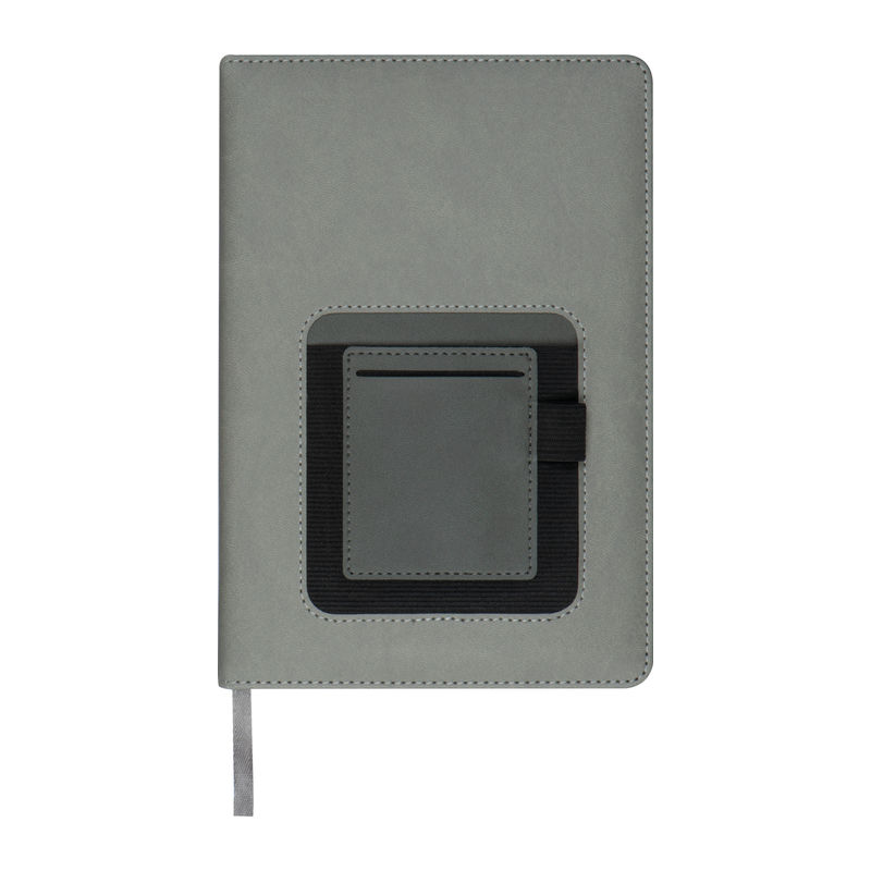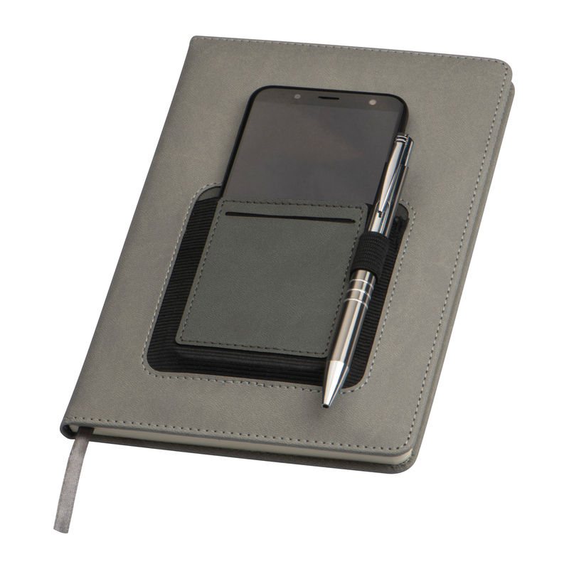 Elegant DIN A5 notebook featuring 160 dotted pages, a bookmark, a ballpoint pen loop, an insert, and an external smartphone compartment on the cover.