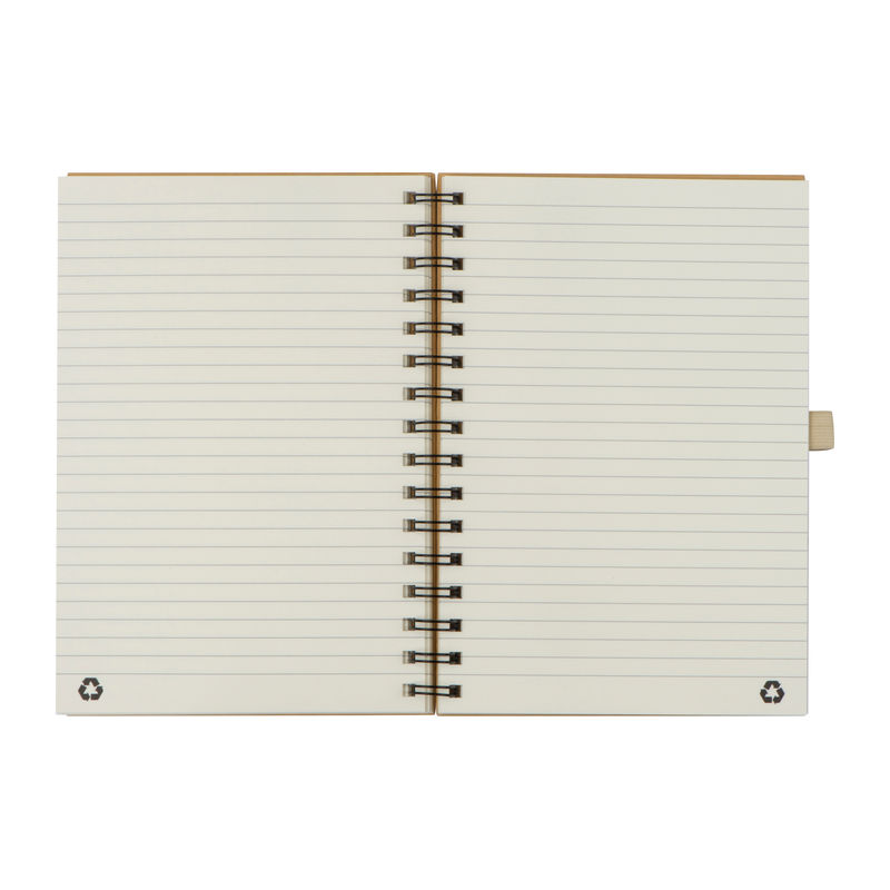 Cardboard notebook with spiral binding, 160 recycled lined pages, pen loop and elastic strap closure. Your logo will be printed on the front