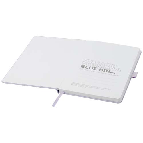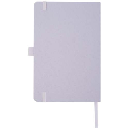 A5 notebook with cover made of RPET fabric. Features 80 sheets 70 g/m2 recycled paper with lined layout, a pen loop, and ribbon marker.