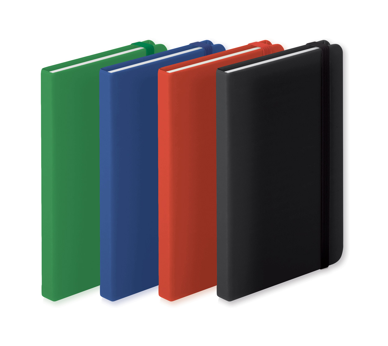 PU leather covered notebook with 100 lined sheets, bookmark and rubber strap. A6 size.