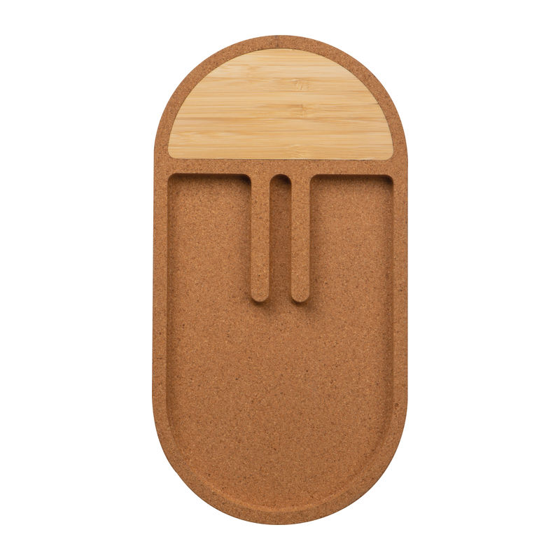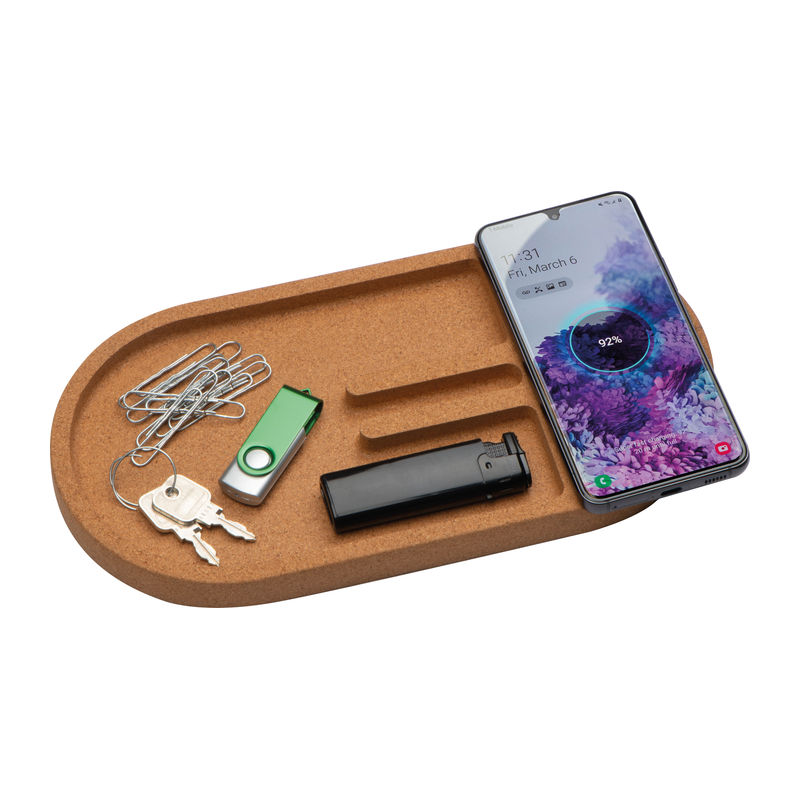 Table organiser crafted from bamboo and cork, featuring a smartphone holder and a 10 Watt induction charger. Each item and engraving is unique due to the natural bamboo material.
