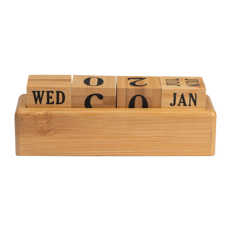 Reusable bamboo desk calendar with non-slip bottom. Your logo will be engraved onto the basis.