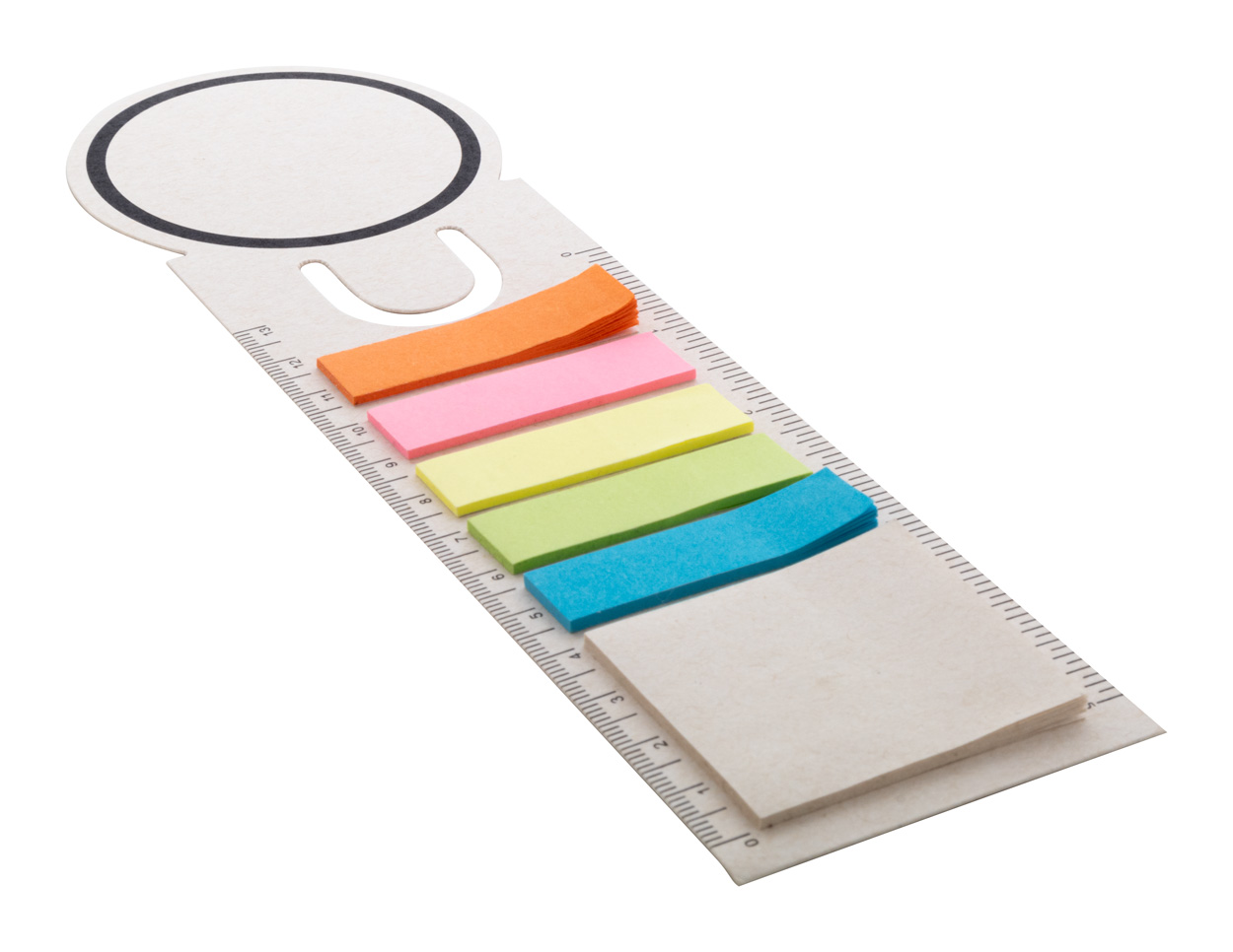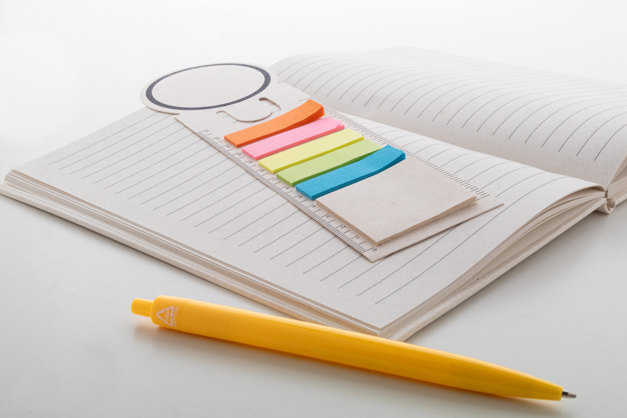 Recycled milk carton paper bookmark and ruler with 15 sticky notes and 75 page markers (in 5 different colours).