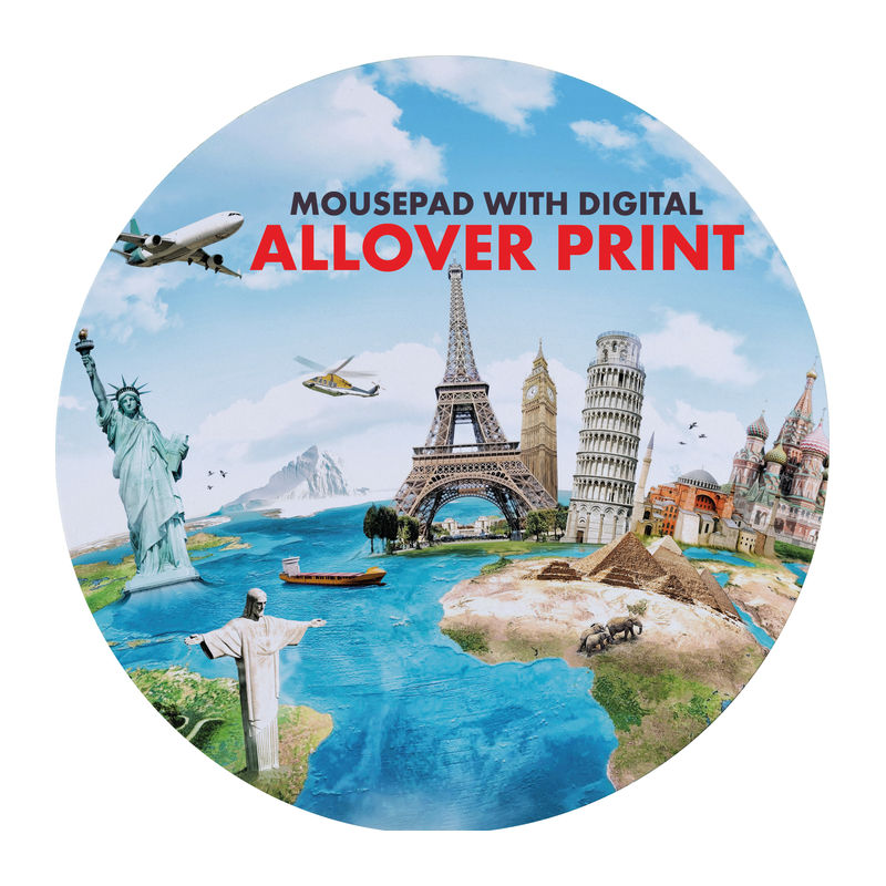 Round mouse pad made of rubber with spandex surface, perfect for allover digital print and suitable for photos or multi-coloured logos with gradients.