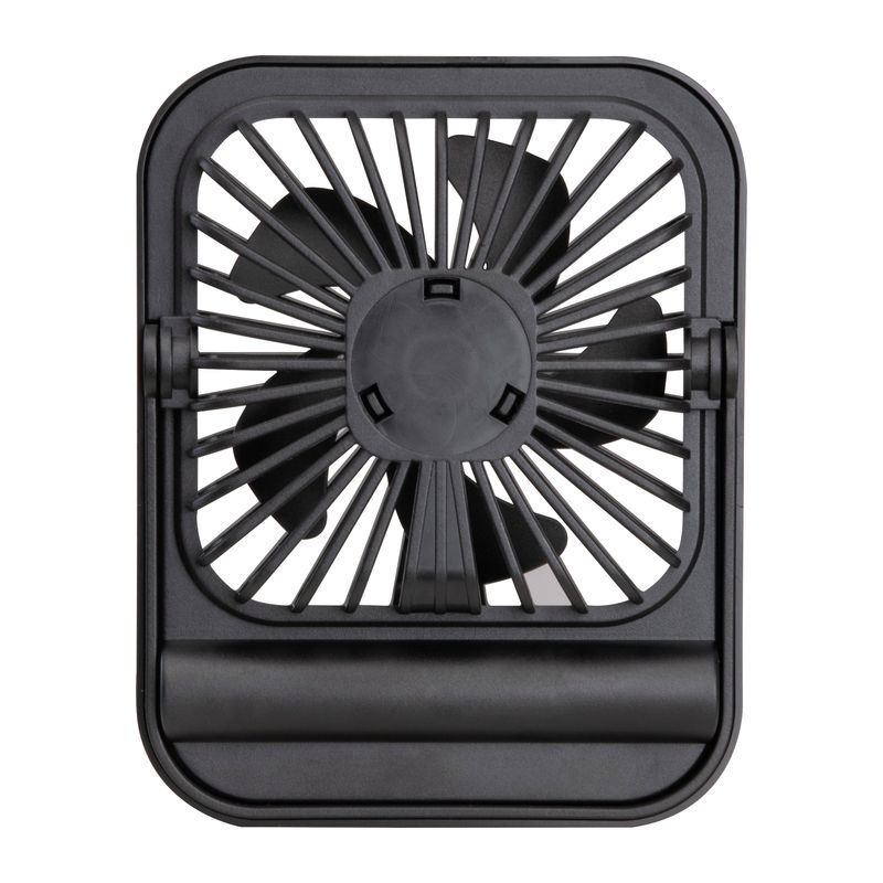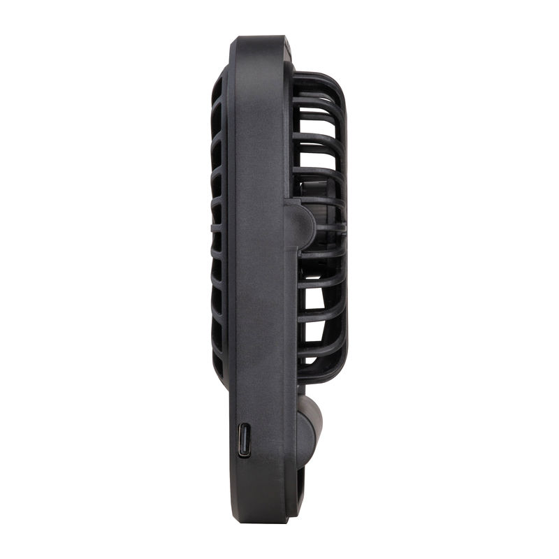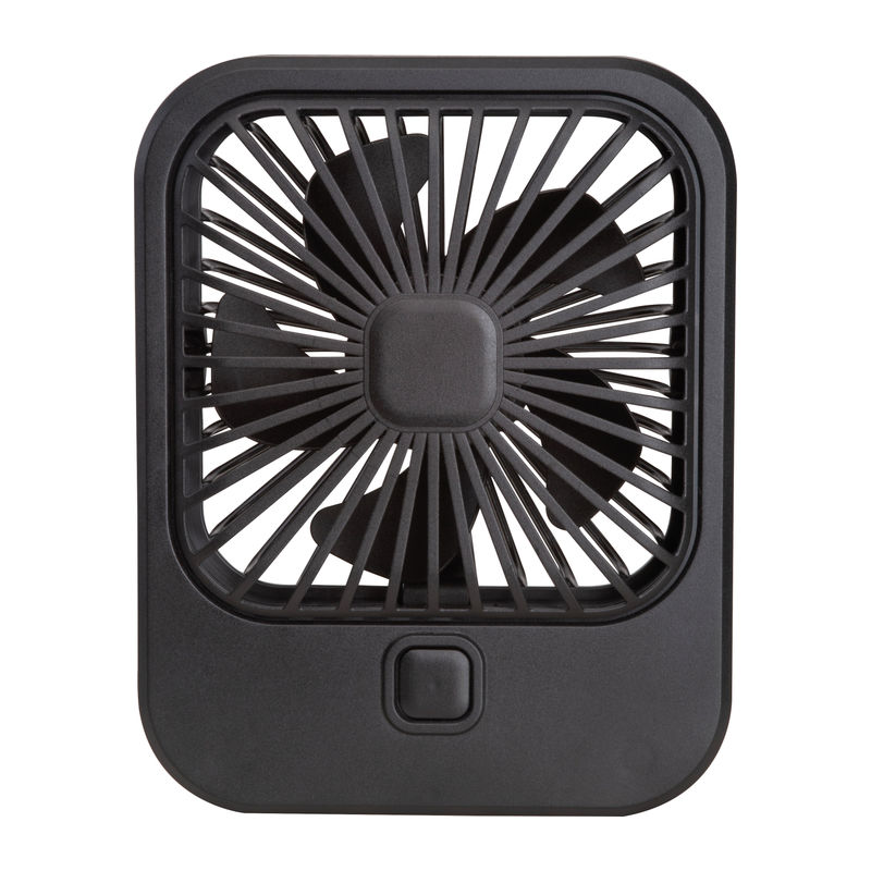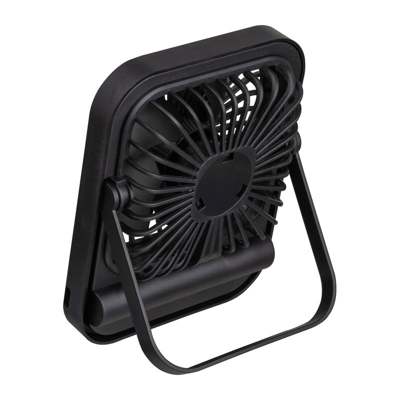 Table fan with rechargeable battery (500 mAh capacity) and type C charging cable. We will print your logo in the lower section.
