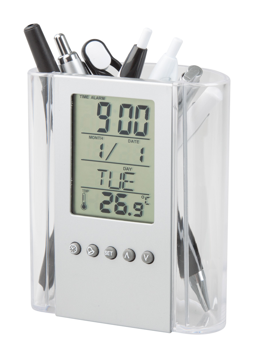Transparent, plastic pen holder with digital display, thermometer, clock, alarm and calendar functions. Delivered with button cell battery.