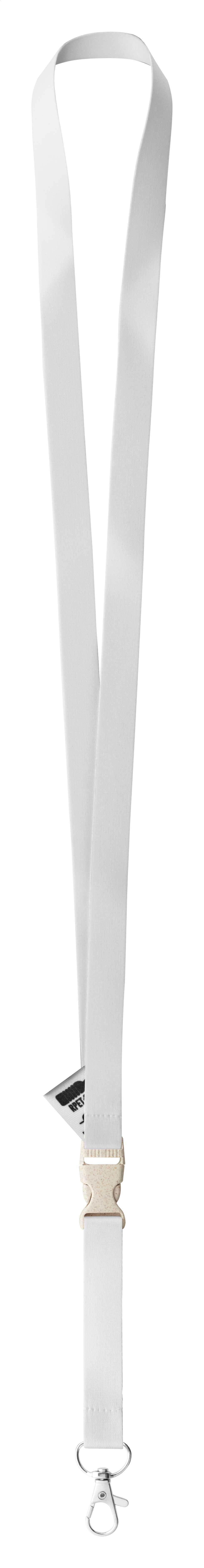 Custom made, 15 mm wide RPET lanyard with detachable metal carabiner and wheat straw plastic buckle. With sublimation printed graphics on both sides. MOQ: 100 pcs.