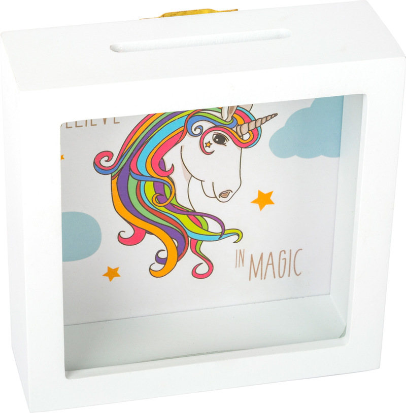 Now saving can be magical! This wooden unicorn savings box in the shape of a picture frame is a real eye-catcher. The best thing: kids can look through the plastic window and see exactly how much money has been put in already. Can be either hung up or placed on a flat surface. It is not only pleasant to look at - it fulfils two functions! With its unicorn print is a real eye-catcher on the wall and it's also an ideal opportunity to squirrel some money away. The money is inserted directly into the opening and can be easily removed again from the reverse side. That makes saving especially fun!