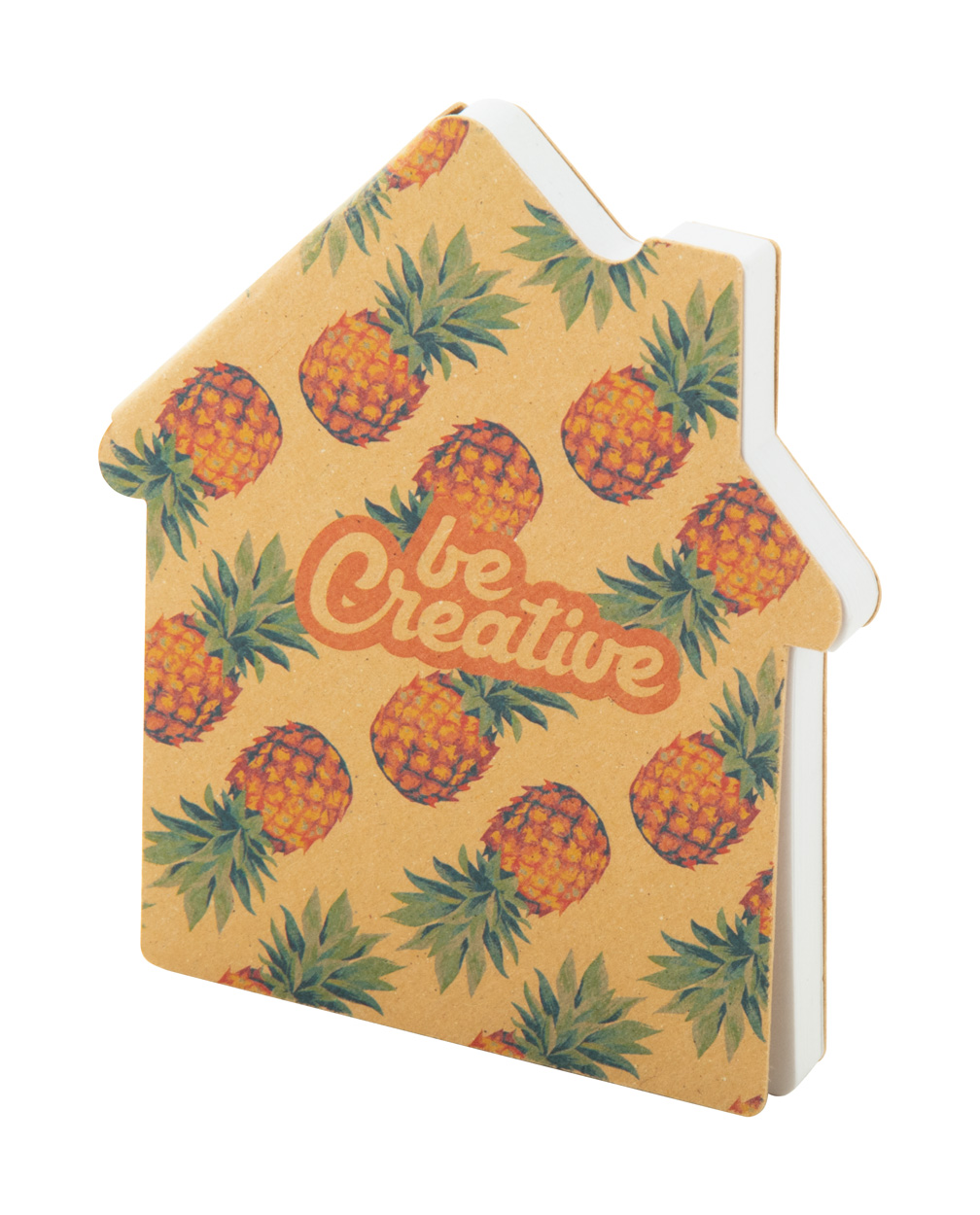 Custom made, recycled kraft paper covered house shaped sticky notepad. Includes 50 sheets of recycled paper sticky notes. Price includes full colour printed outside cover. MOQ: 100 pcs.