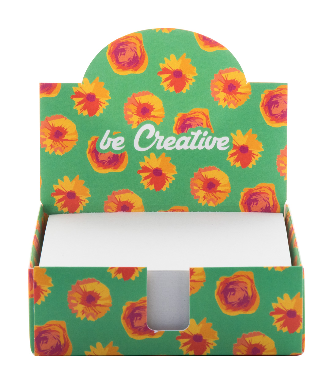 Custom made, paper note dispenser with 300 sheets memo block in recycled paper (90×90 mm). Price includes full colour printing on the holder. MOQ: 100 pcs.