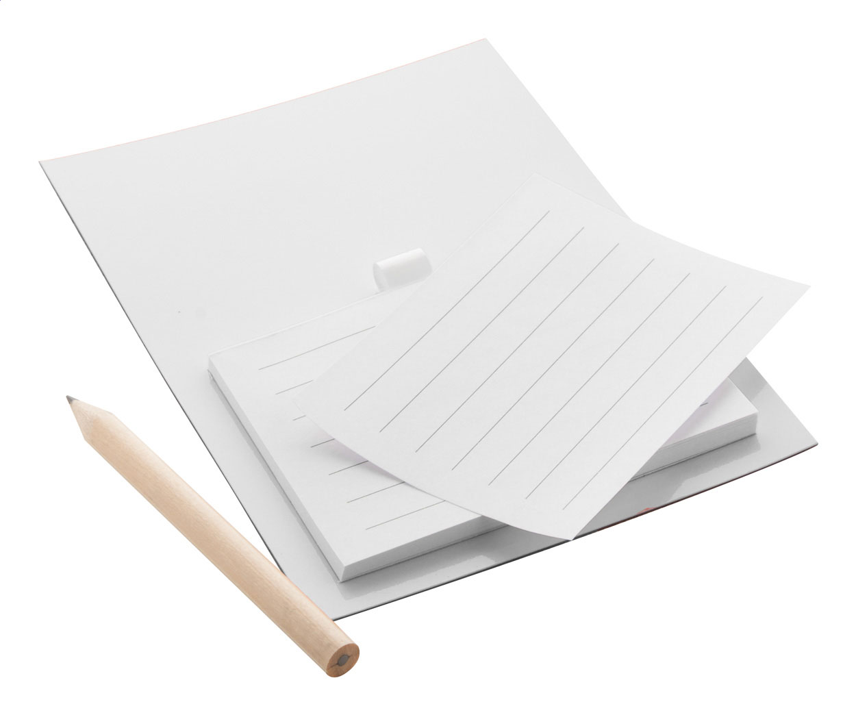 Coloured fridge magnet with 40 sheets notepad and mini wooden pencil.