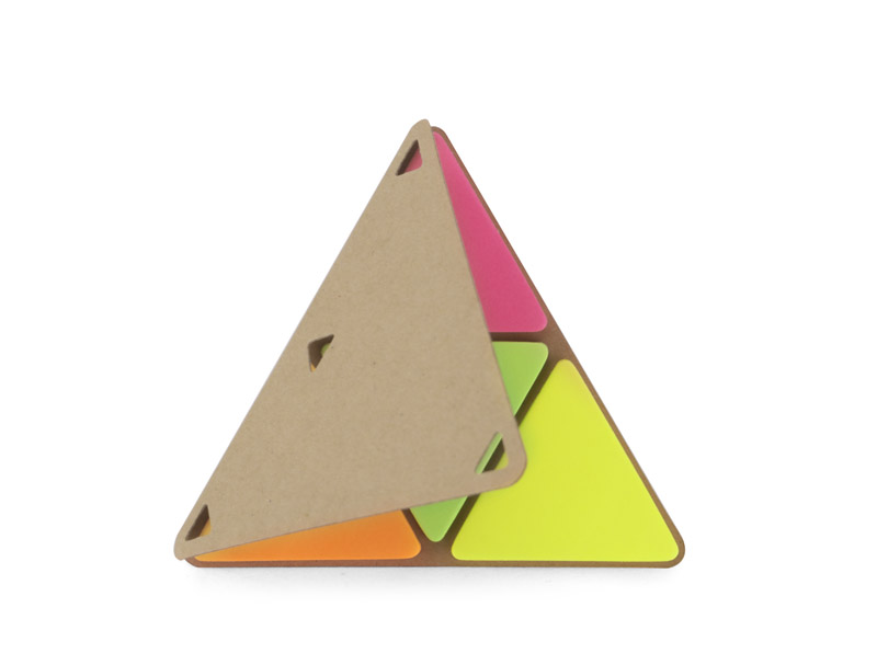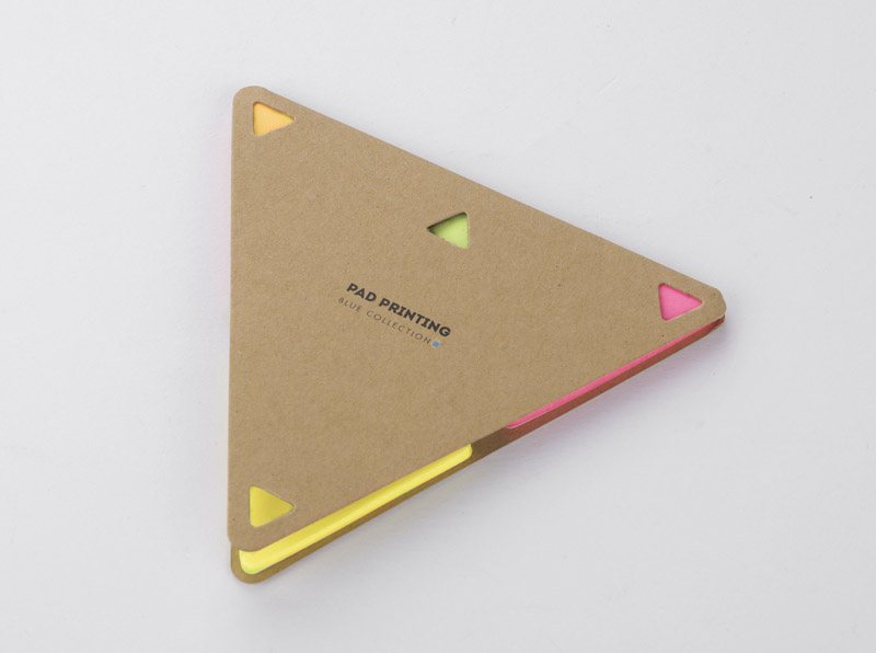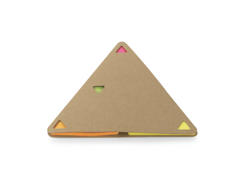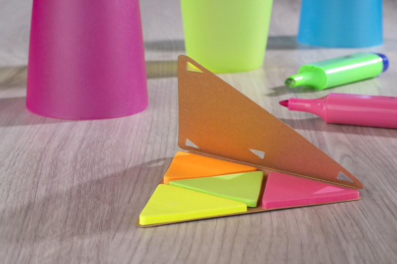 PEL sticky notes in the shape of a triangle with an eco-friendly paper cover. Inside there are 25 pieces of cards in 4 colors: orange, pink, green, yellow.