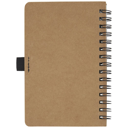 A6-size wire-o recycled cardboard cover notebook with pen loop. Features 70 sheets 60 g/m² lined inner pages made from stone. Stone paper is 100% tree free and the production process uses less energy compared to recycled or new pulp paper. The paper is water and tear resistant and has a natural white colour (no bleaching involved).