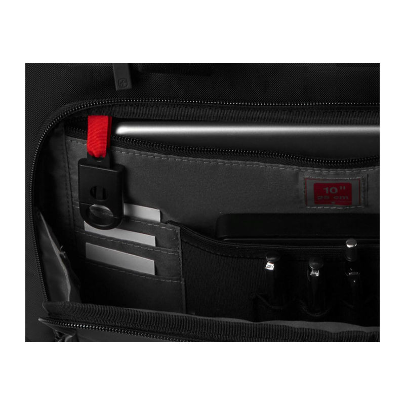 Bag with padded 16" laptop compartment and 10" tablet / eReader pocket with anti-scratch lining, dual storage compartments, file divider for documents, quick pocket for easy access to essentials, padded handles, adjustable padded shoulder strap.