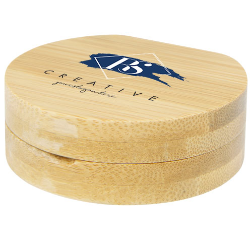 Compact pocket bamboo mirror for travel or daily skincare or makeup use. There is a small compartment at the bottom of the mirror for small accessories. The bamboo used is sourced and produced following sustainable standards.