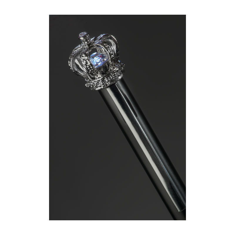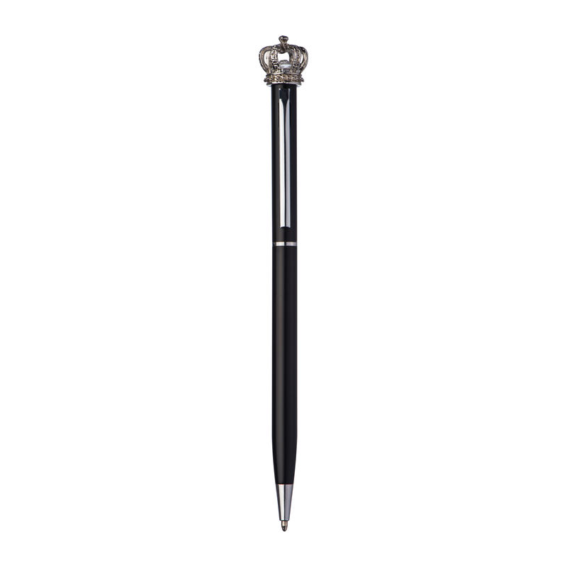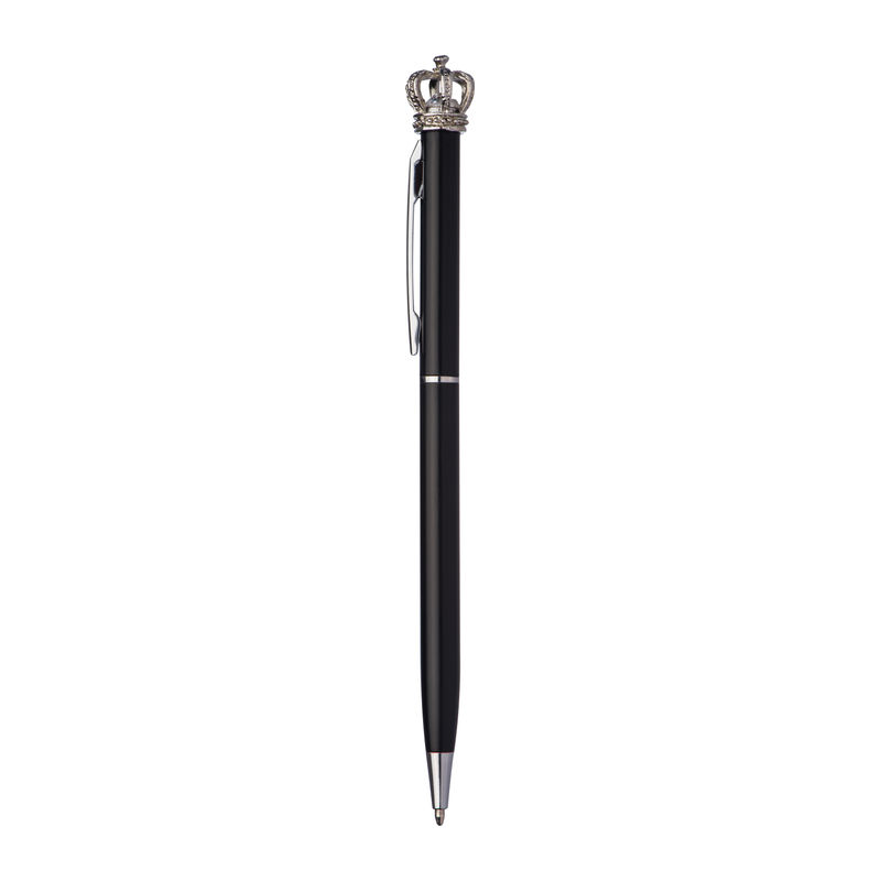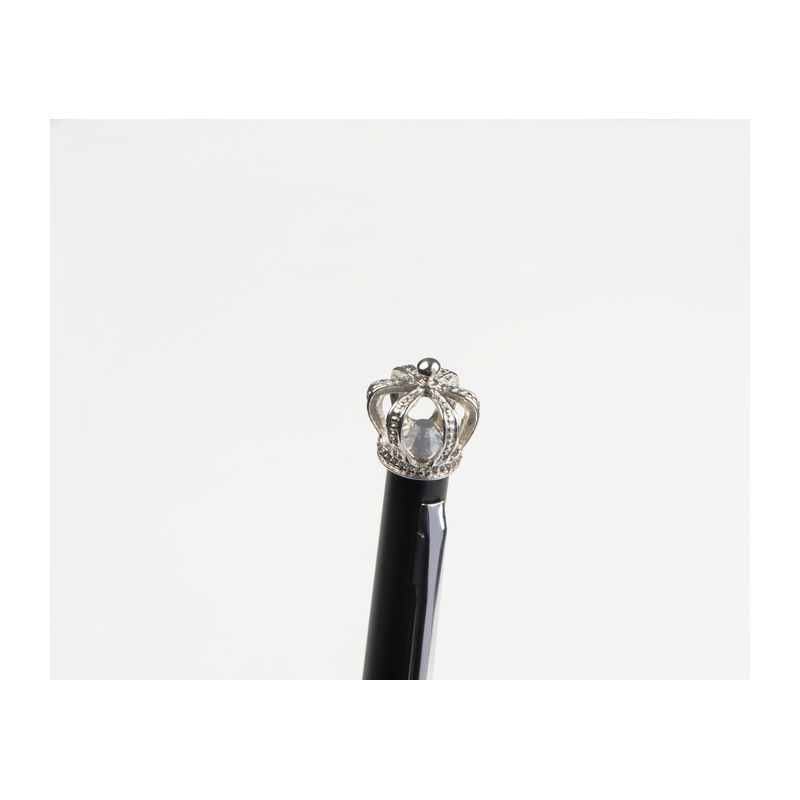 Slim metal ballpen featuring a blue ink refill. The distinctive crown and small glass diamond embellishment render this pen truly unique.