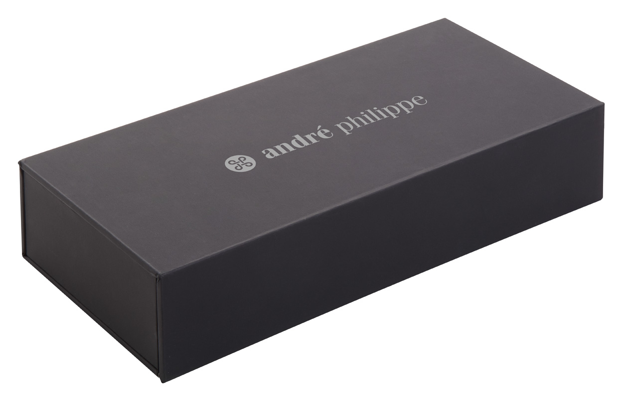 Elegant, metal ballpoint and roller pen set with rosewood barrel. In black gift box, with blue refill. André Philippe brand product.
