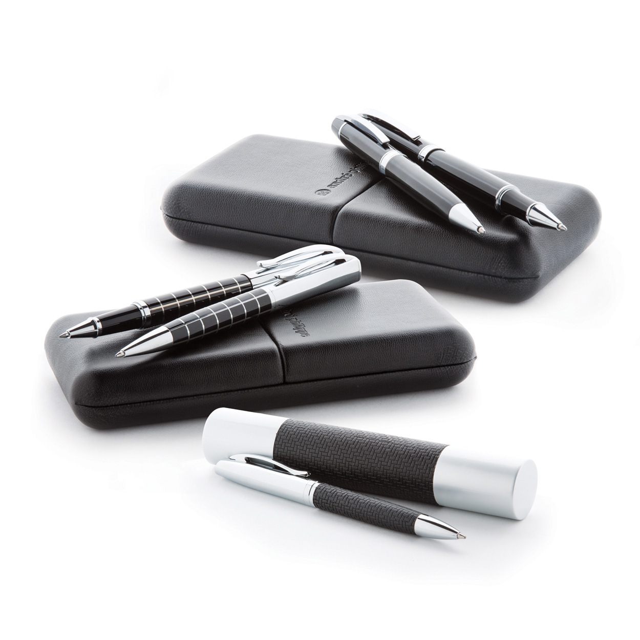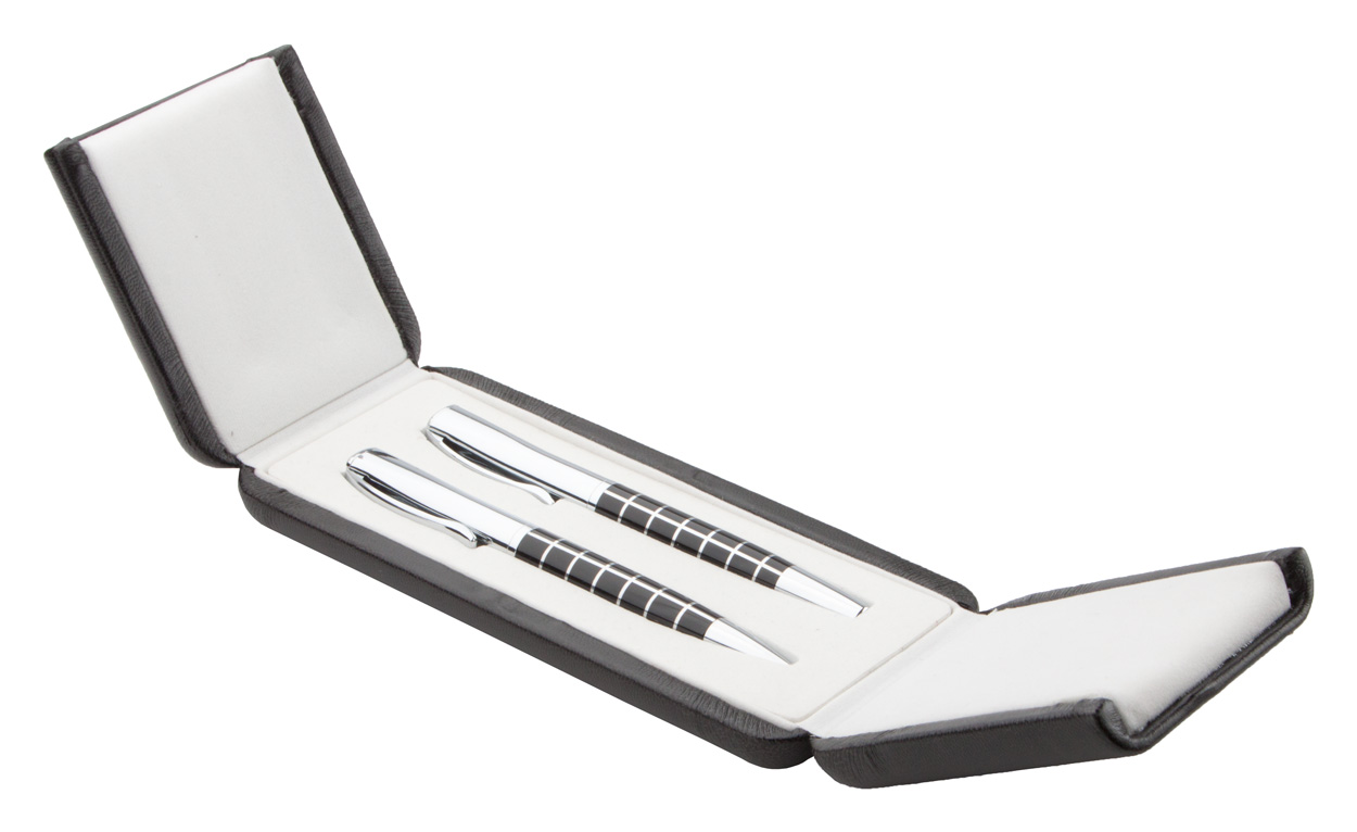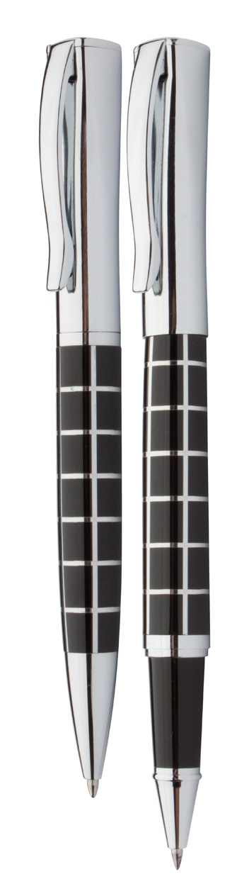 Elegant, metal ballpoint pen and roller pen set, with shiny chrome parts and patterned barrel. In PU leather gift box, with blue refill. André Philippe brand product.