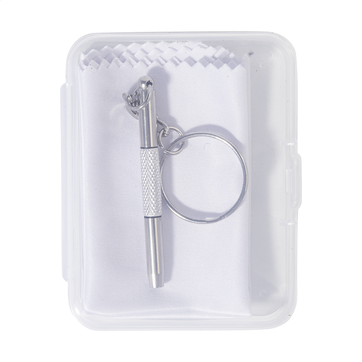 Compact glasses repair kit in transparent PP box. Including 100% RPET microfibre (220 g/m²) cleaning cloth and mini screwdriver with keyring. Cloth size: 18×15 cm.