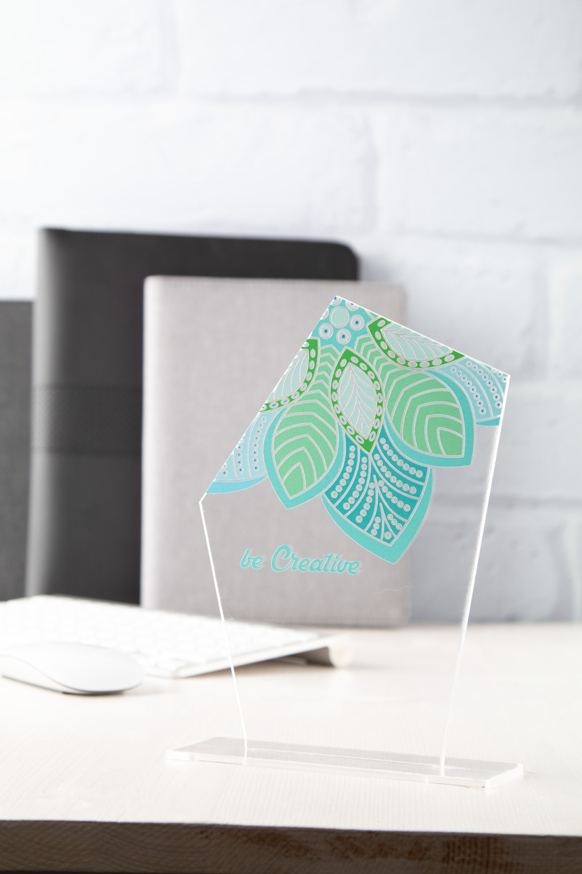 Custom made acrylic trophy with unique shape and full colour graphics. Price inlcudes UV LED printing. MOQ: 50 pcs. Delivered flat-packed.