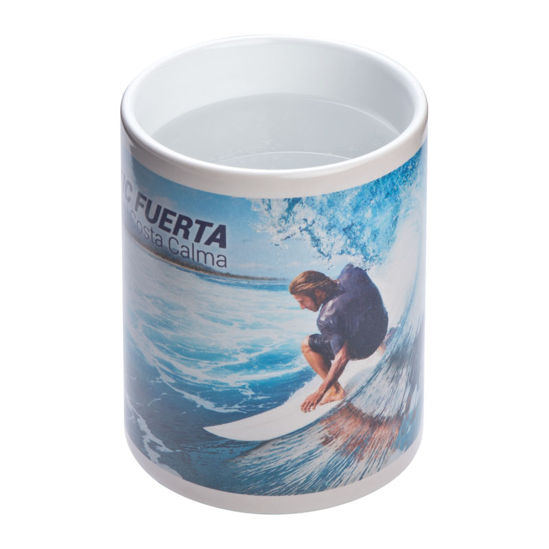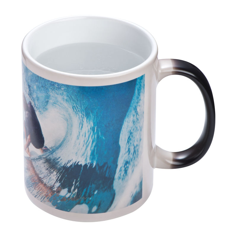 Effective sublimation mug: when cold the imprint vanishes under the coloured lacquering. As soon as hot liquid is filled in, the coloured imprint appears. Your logo is printed allover the mug, even photo prints are possible.