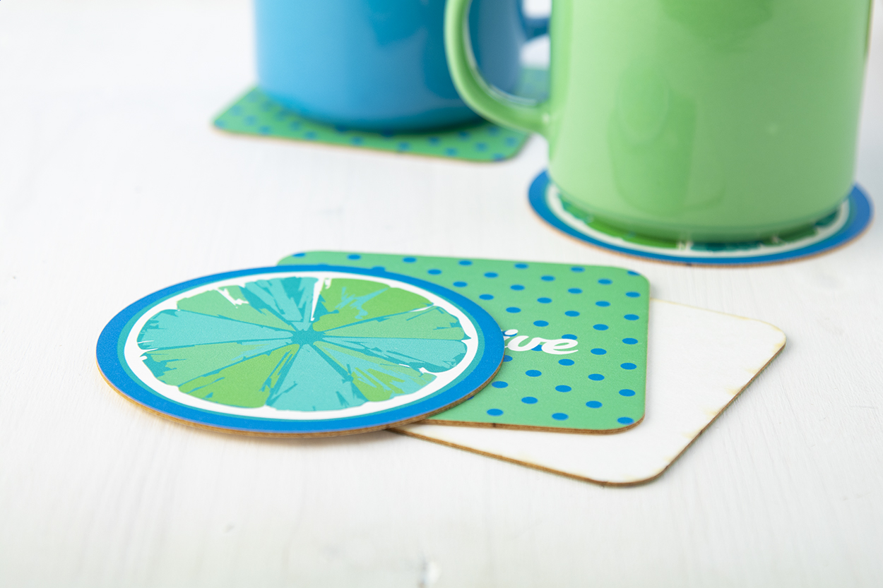 Custom made, absorbent paper coaster with custom graphics on one side. MOQ: 250 pcs.