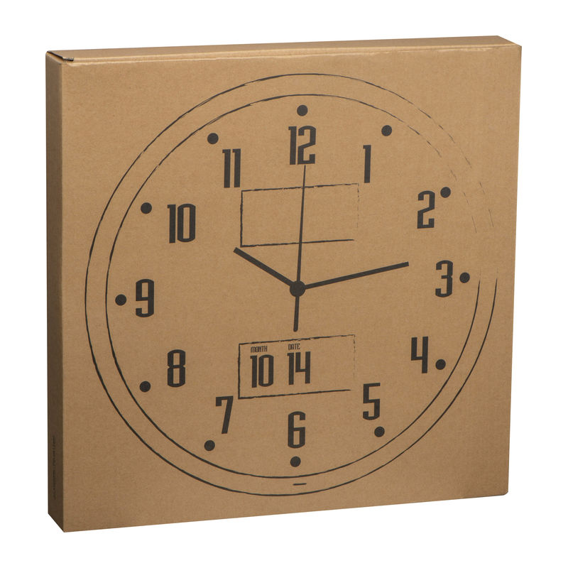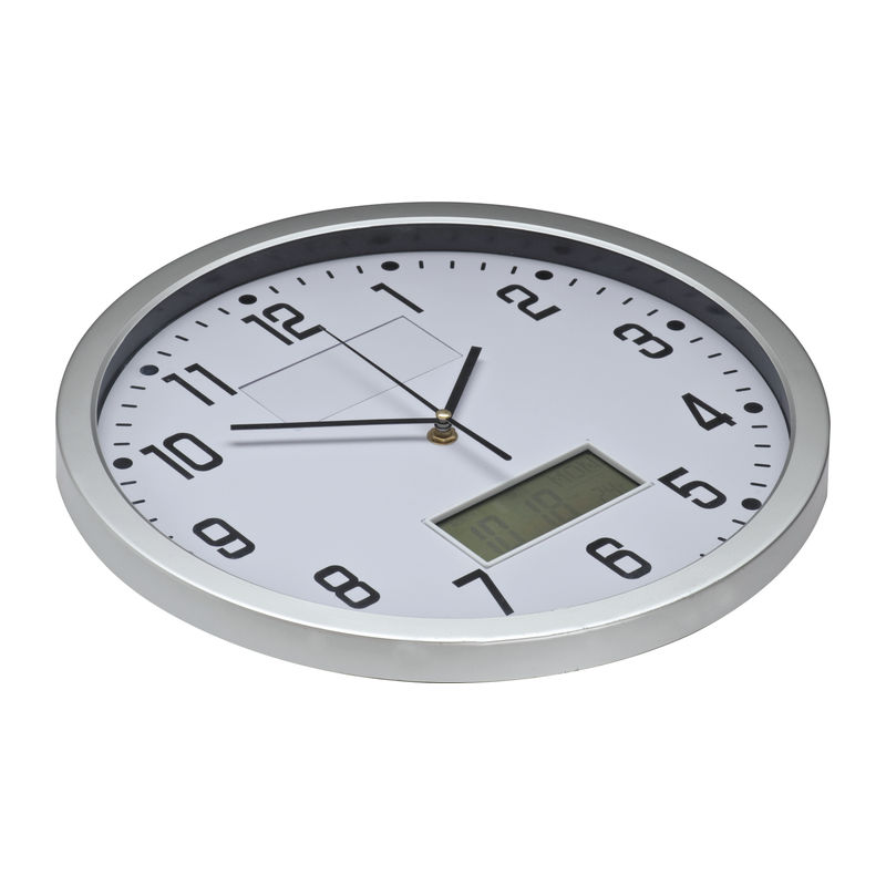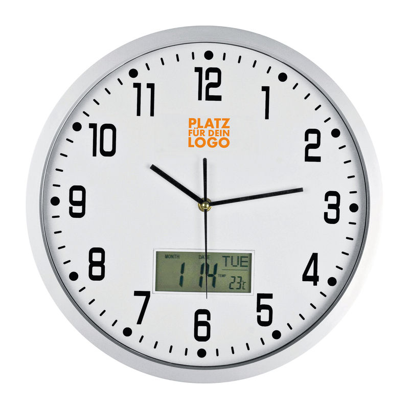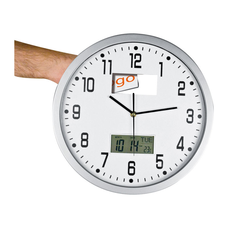 Exclusive, pioneering CrisMa design analogue wall clock, displays date, day and temperature. We will print your logo on the area below the number 12.