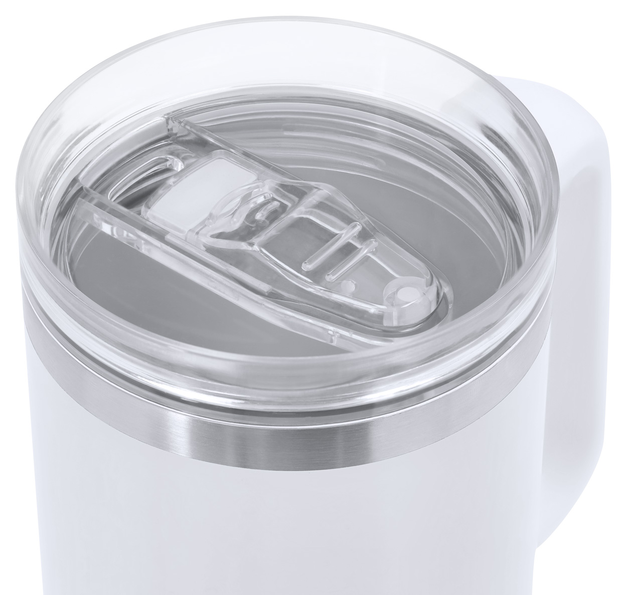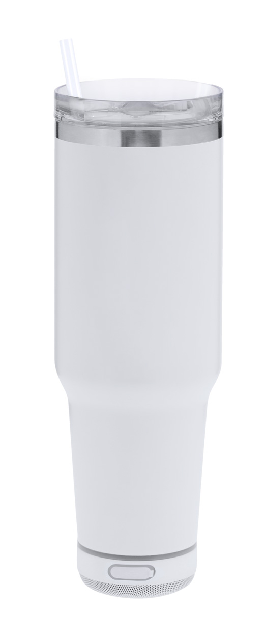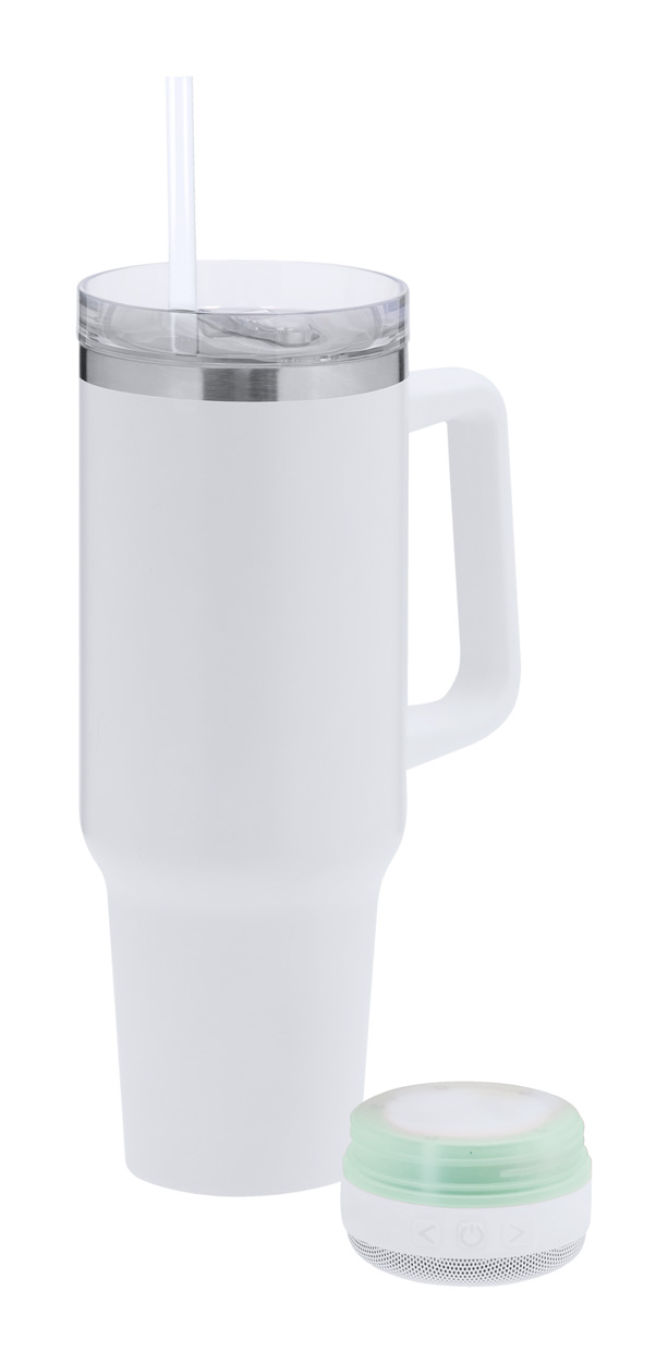 Double-wall, stainless steel insulated thermo mug with drinking lid, straw and wireless speaker with multicolour LED lights, hands-free call function and built-in rechargeable battery. 1250 ml.