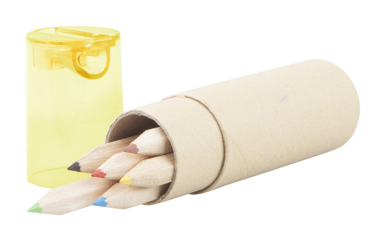 6 pc coloured pencil set in round cardboard case with plastic sharpener.