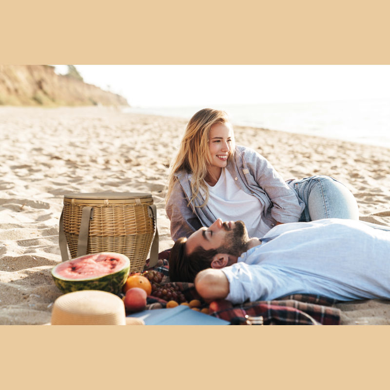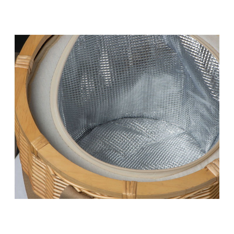 Mark Twain rattan picnic basket with a large main cooler compartment. The bamboo lid can be used as cuttingboard or serving board while the basket itself makes a perfect picnic table. We laser your logo onto the board.